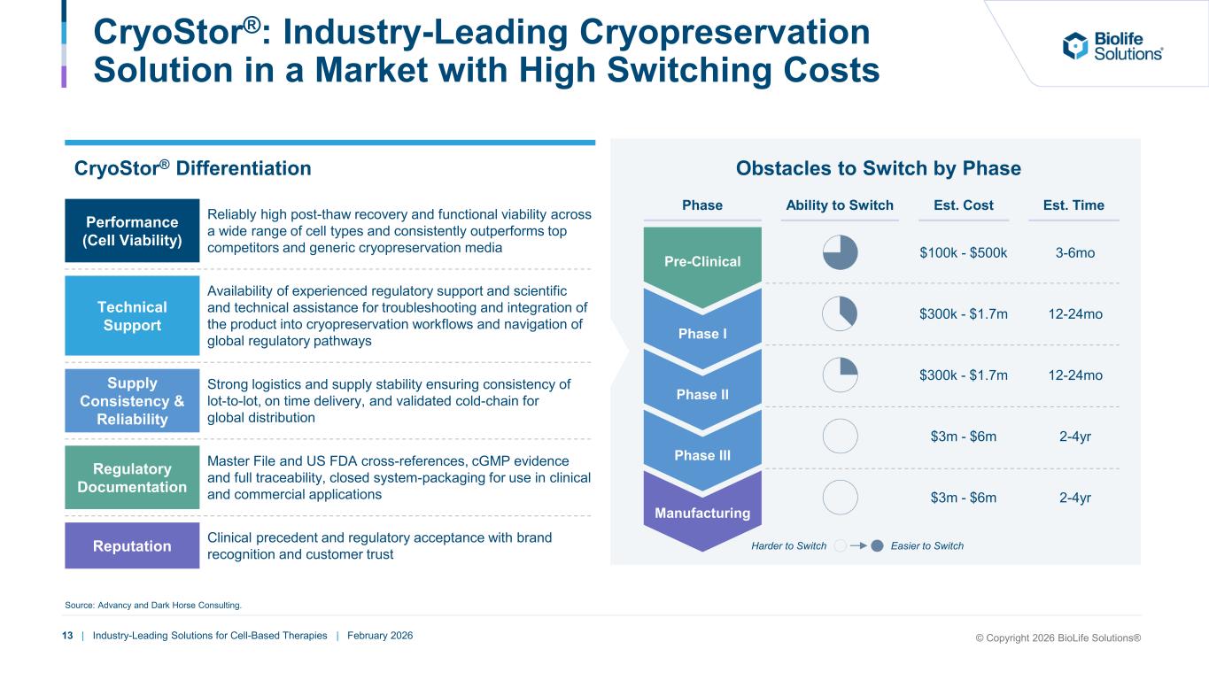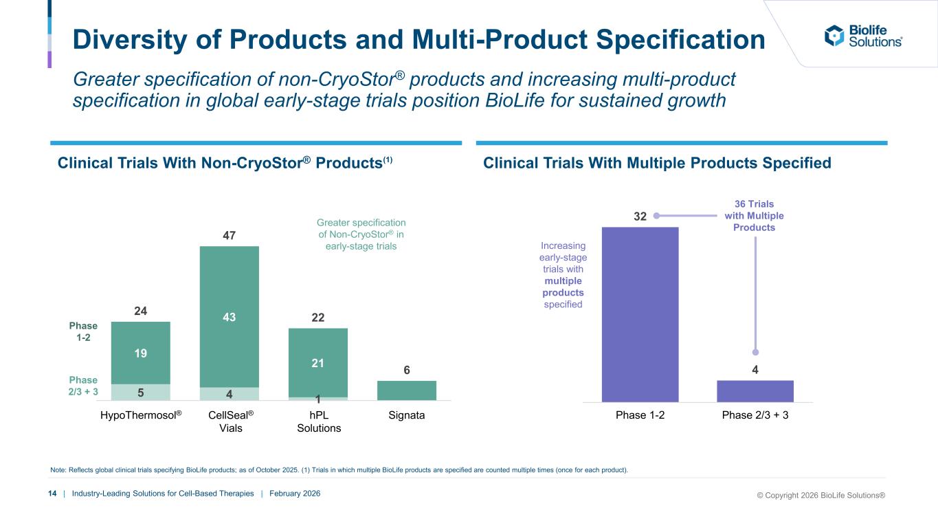 13 | Industry-Leading Solutions for Cell-Based Therapies | February 2026 CryoStor®: Industry-Leading Cryopreservation Solution in a Market with High Switching Costs CryoStor® Differentiation Obstacles to Switch by Phase Performance (Cell Viability) Regulatory Documentation Technical Support Supply Consistency & Reliability Source: Advancy and Dark Horse Consulting. Clinical precedent and regulatory acceptance with brand recognition and customer trust Master File and US FDA cross-references, cGMP evidence and full traceability, closed system-packaging for use in clinical and commercial applications Pre-Clinical $100k - $500k $300k - $1.7m $300k - $1.7m $3m - $6m $3m - $6m 3-6mo 12-24mo 12-24mo 2-4yr 2-4yr Phase I Phase II Phase III Manufacturing Phase Ability to Switch Est. Cost Est. Time Easier to SwitchHarder to Switch Reliably high post-thaw recovery and functional viability across a wide range of cell types and consistently outperforms top competitors and generic cryopreservation media Availability of experienced regulatory support and scientific and technical assistance for troubleshooting and integration of the product into cryopreservation workflows and navigation of global regulatory pathways Strong logistics and supply stability ensuring consistency of lot-to-lot, on time delivery, and validated cold-chain for global distribution Reputation © Copyright 2026 BioLife Solutions®