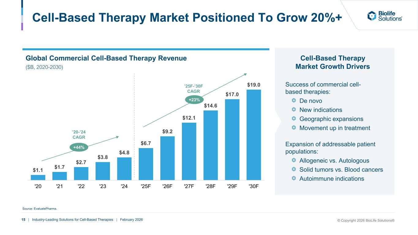 14 | Industry-Leading Solutions for Cell-Based Therapies | February 2026 Diversity of Products and Multi-Product Specification Greater specification of non-CryoStor® products and increasing multi-product specification in global early-stage trials position BioLife for sustained growth Note: Reflects global clinical trials specifying BioLife products; as of October 2025. (1) Trials in which multiple BioLife products are specified are counted multiple times (once for each product). 5 4 1 19 43 21 24 47 22 6 HTS CSV HPL SignataHypoThermosol® h Solutions Phase 2/3 + 3 Phase 1-2 Greater specification of Non-CryoStor® in early-stage trials Clinical Trials With Non-CryoStor® Products(1) Clinical Trials With Multiple Products Specified Cell eal® Vials Increasing early-stage trials with multiple products specified 32 4 Phase 1-2 Phase 2/3 + 3 36 Trials with Multiple Products © Copyright 2026 BioLife Solutions®