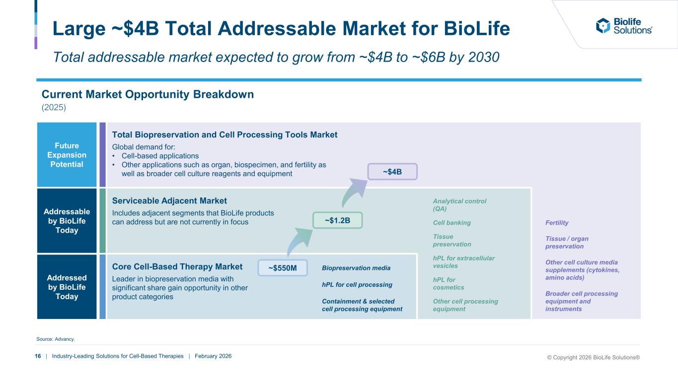 15 | Industry-Leading Solutions for Cell-Based Therapies | February 2026 +12% ‘25-’30 CAGR 23K 30K 50K33K Global Number of Cell-Based Therapy Patients (Clinical & Commercial) 34K 42K 59K 68K 74K 81K 89K $1.1 $1.7 $2.7 $3.8 $4.8 $6.7 $9.2 $12.1 $14.6 $17.0 $19.0 '20 '21 '22 '23 ' 4 '25F '26F '27F '28F '29F '30F Cell-Based Therapy Market Positioned To Grow 20%+ Success of commercial cell- based therapies: De novo New indications Geographic expansions Movement up in treatment Cell-Based Therapy Market Growth Drivers Global Commercial Cell-Based Therapy Revenue ($B, 2020-2030) Expansion of addressable patient populations: Allogeneic vs. Autologous Solid tumors vs. Blood cancers Autoimmune indications Source: EvaluatePharma. ’25F-’30F CAGR +23% +44% ’20-’24 CAGR © Copyright 2026 BioLife Solutions®