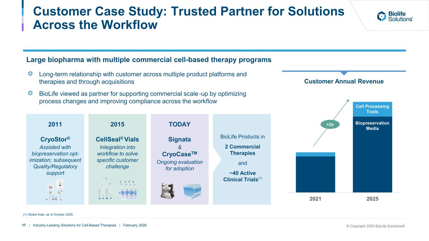 16 | Industry-Leading Solutions for Cell-Based Therapies | February 2026 Large ~$4B Total Addressable Market for BioLife Current Market Opportunity Breakdown (2025) Addressable by BioLife Today Future Expansion Potential Source: Advancy. Total Biopreservation and Cell Processing Tools Market Global demand for: • Cell-based applications • Other applications such as organ, biospecimen, and fertility as well as broader cell culture reagents and equipment Serviceable Adjacent Market Includes adjacent segments that BioLife products can address but are not currently in focus Core Cell-Based Therapy Market Leader in biopreservation media with significant share gain opportunity in other product categories ~$550M Analytical control (QA) Cell banking Tissue preservation hPL for extracellular vesicles Other cell processing equipment hPL for cosmetics ~$1.2B ~$4B Fertility Tissue / organ preservation Other cell culture media supplements (cytokines, amino acids) Broader cell processing equipment and instruments Addressed by BioLife Today Total addressable market expected to grow from ~$4B to ~$6B by 2030 hPL for cell processing Biopreservation media Containment & selected cell processing equipment © Copyright 2026 BioLife Solutions®