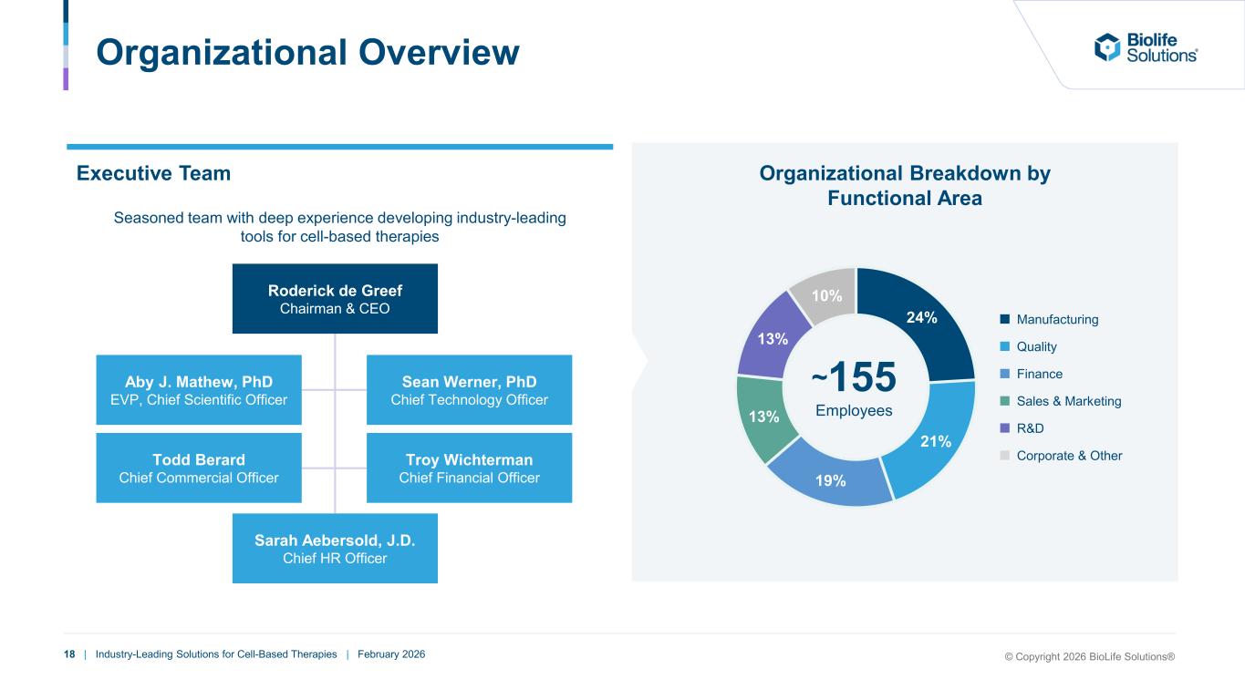 17 | Industry-Leading Solutions for Cell-Based Therapies | February 2026 2021 2025 Customer Annual Revenue Customer Case Study: Trusted Partner for Solutions Across the Workflow Large biopharma with multiple commercial cell-based therapy programs Long-term relationship with customer across multiple product platforms and therapies and through acquisitions BioLife viewed as partner for supporting commercial scale -up by optimizing process changes and improving compliance across the workflow 2011 CryoStor® Assisted with biopreservation opt- imization; subsequent Quality/Regulatory support 2015 CellSeal® Vials Integration into workflow to solve specific customer challenge TODAY Signata & CryoCaseTM Ongoing evaluation for adoption >2x BioLife Products in 2 Commercial Therapies and ~40 Active Clinical Trials(1) (1) Global trials; as of October 2025. Cell Processing Tools Biopreservation Media © Copyright 2026 BioLife Solutions®