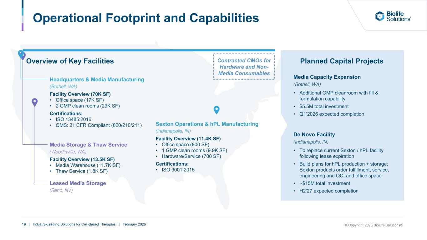 18 | Industry-Leading Solutions for Cell-Based Therapies | February 2026 Organizational Overview Organizational Breakdown by Functional Area 24% 21% 19% 13% 13% 10% ~155 Employees Quality Manufacturing Finance Sales & Marketing R&D Corporate & Other Executive Team Roderick de Greef Chairman & CEO Aby J. Mathew, PhD EVP, Chief Scientific Officer Sarah Aebersold, J.D. Chief HR Officer Sean Werner, PhD Chief Technology Officer Troy Wichterman Chief Financial Officer Seasoned team with deep experience developing industry-leading tools for cell-based therapies Todd Berard Chief Commercial Officer © Copyright 2026 BioLife Solutions®