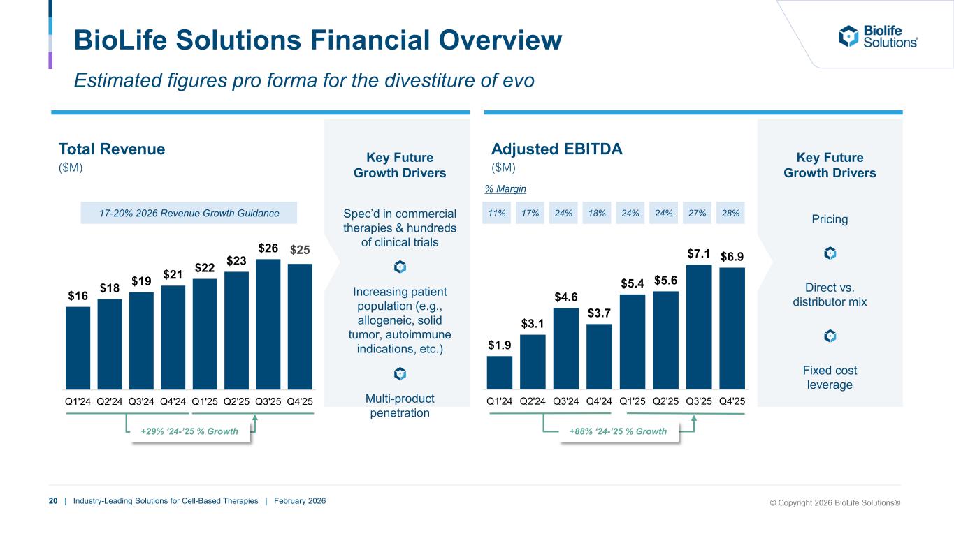 19 | Industry-Leading Solutions for Cell-Based Therapies | February 2026 Operational Footprint and Capabilities Overview of Key Facilities Media Capacity Expansion (Bothell, WA) • Additional GMP cleanroom with fill & formulation capability • $5.5M total investment • Q1’2026 expected completion De Novo Facility (Indianapolis, IN) • To replace current Sexton / hPL facility following lease expiration • Build plans for hPL production + storage; Sexton products order fulfillment, service, engineering and QC; and office space • ~$15M total investment • H2’27 expected completion Planned Capital Projects Headquarters & Media Manufacturing (Bothell, WA) Facility Overview (70K SF) • Office space (17K SF) • 2 GMP clean rooms (29K SF) Certifications: • ISO 13485:2016 • QMS: 21 CFR Compliant (820/210/211) Sexton Operations & hPL Manufacturing (Indianapolis, IN) Facility Overview (11.4K SF) • Office space (800 SF) • 1 GMP clean rooms (9.9K SF) • Hardware/Service (700 SF) Certifications: • ISO 9001:2015 Media Storage & Thaw Service (Woodinville, WA) Facility Overview (13.5K SF) • Media Warehouse (11.7K SF) • Thaw Service (1.8K SF) Contracted CMOs for Hardware and Non- Media Consumables Leased Media Storage (Reno, NV) © Copyright 2026 BioLife Solutions®