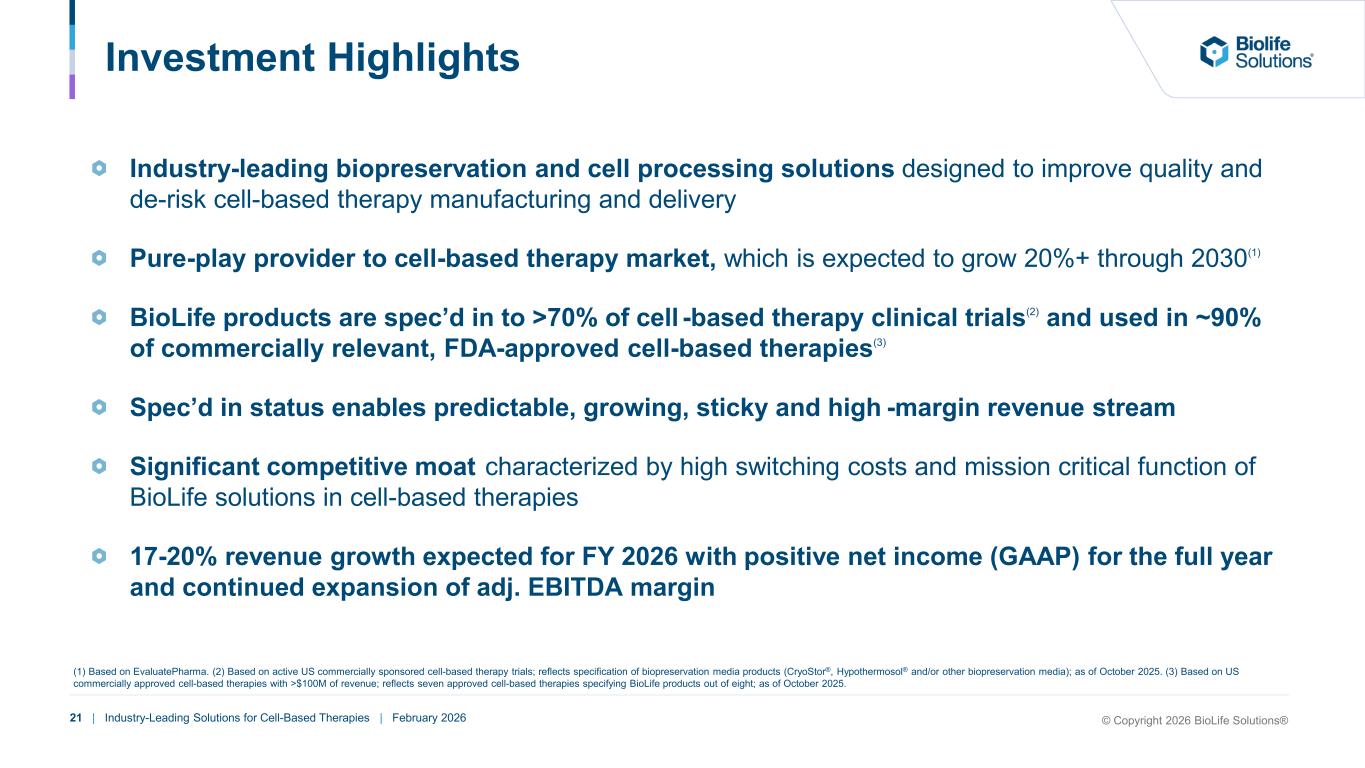 20 | Industry-Leading Solutions for Cell-Based Therapies | February 2026 © Copyright 2026 BioLife Solutions® BioLife Solutions Financial Overview Total Revenue ($M) Adjusted EBITDA ($M) $25 $16 $18 $19 $21 $22 $23 $26 Q1'24 Q2'24 Q3'24 Q4'24 Q1'25 Q2'25 Q3'25 Q4'25 Key Future Growth Drivers +29% ‘24-’25 % Growth 17-20% 2026 Revenue Growth Guidance $1.9 $3.1 $4.6 $3.7 $5.4 $5.6 $7.1 $6.9 Q1'24 Q2'24 Q3'24 Q4'24 Q1'25 Q2'25 Q3'25 Q4'25 24% 27%24% 28% % Margin 18%24%17% +88% ‘24-’25 % Growth Spec’d in commercial therapies & hundreds of clinical trials Increasing patient population (e.g., allogeneic, solid tumor, autoimmune indications, etc.) Multi-product penetration Estimated figures pro forma for the divestiture of evo Key Future Growth Drivers Pricing Direct vs. distributor mix Fixed cost leverage 11%
