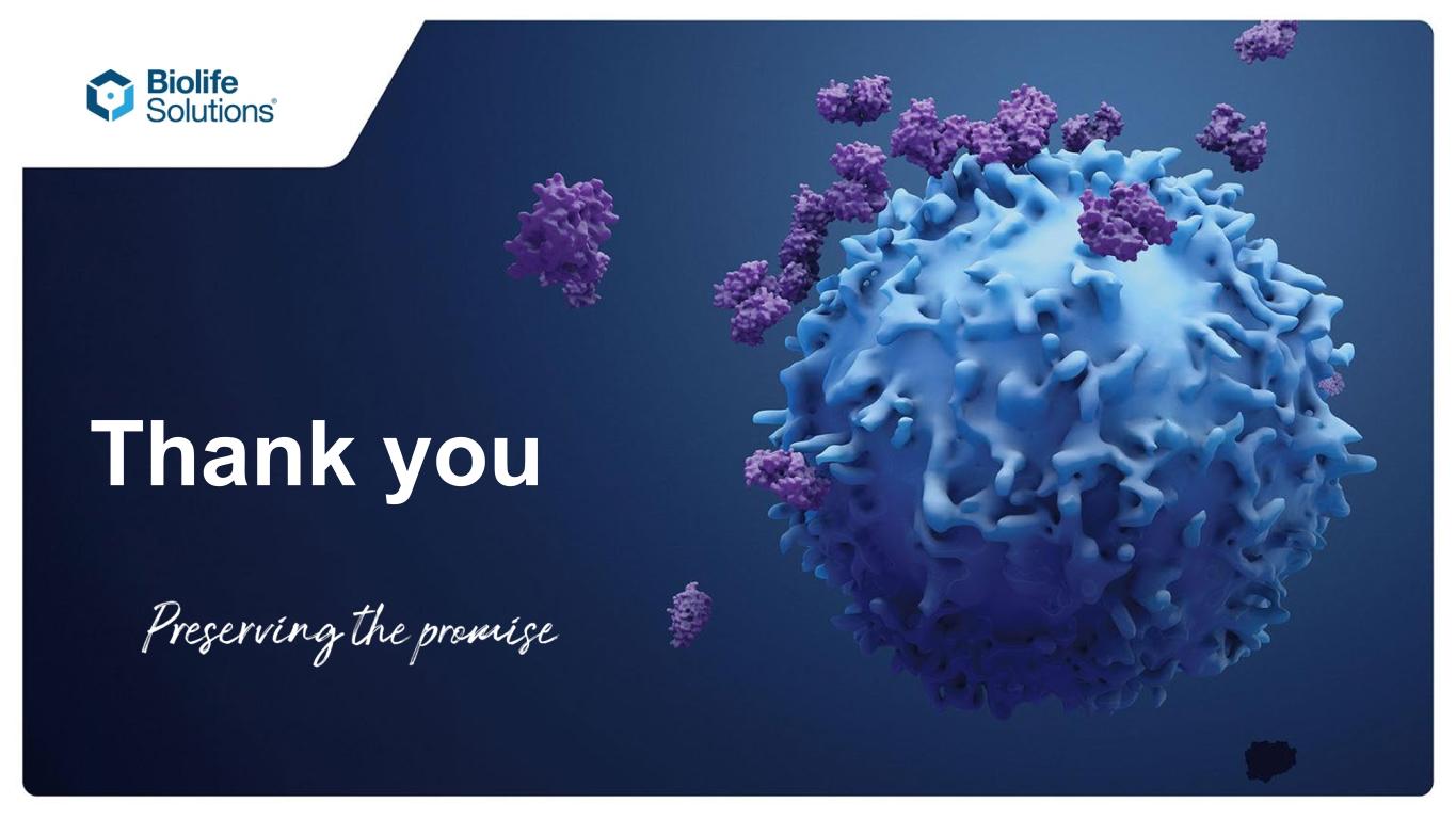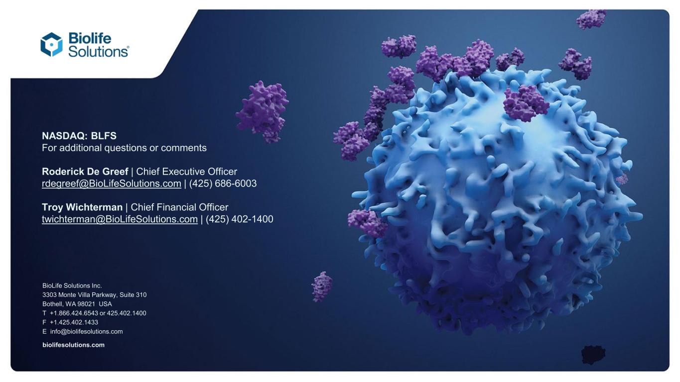 © Copyright 2026 BioLife Solutions® BioLife Solutions Inc. 3303 Monte Villa Parkway, Suite 310 Bothell, WA 98021 USA T +1.866.424.6543 or 425.402.1400 F +1.425.402.1433 E info@biolifesolutions.com biolifesolutions.com NASDAQ: BLFS For additional questions or comments Roderick De Greef | Chief Executive Officer rdegreef@BioLifeSolutions.com | (425) 686-6003 Troy Wichterman | Chief Financial Officer twichterman@BioLifeSolutions.com | (425) 402-1400