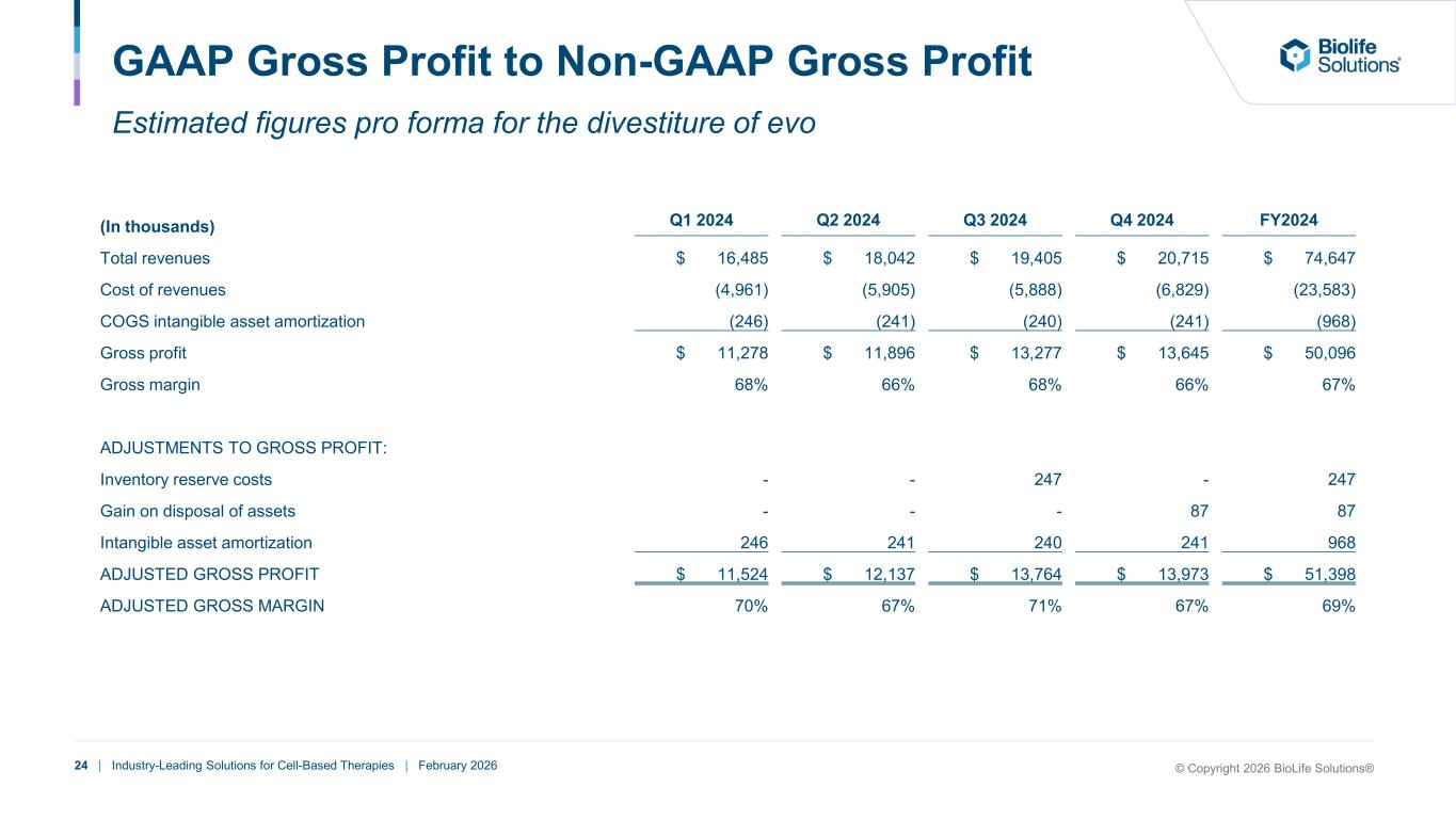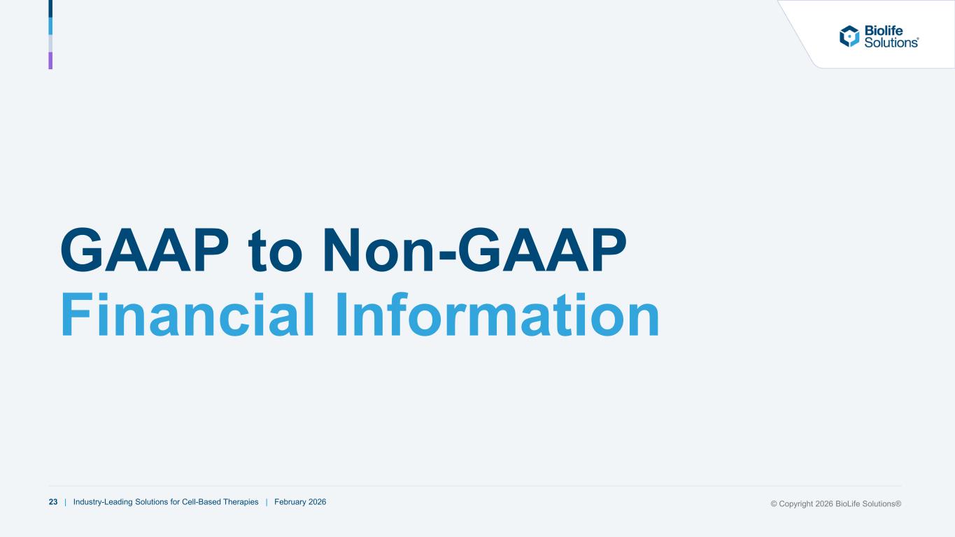23 | Industry-Leading Solutions for Cell-Based Therapies | February 2026 GAAP to Non-GAAP Financial Information © Copyright 2026 BioLife Solutions®