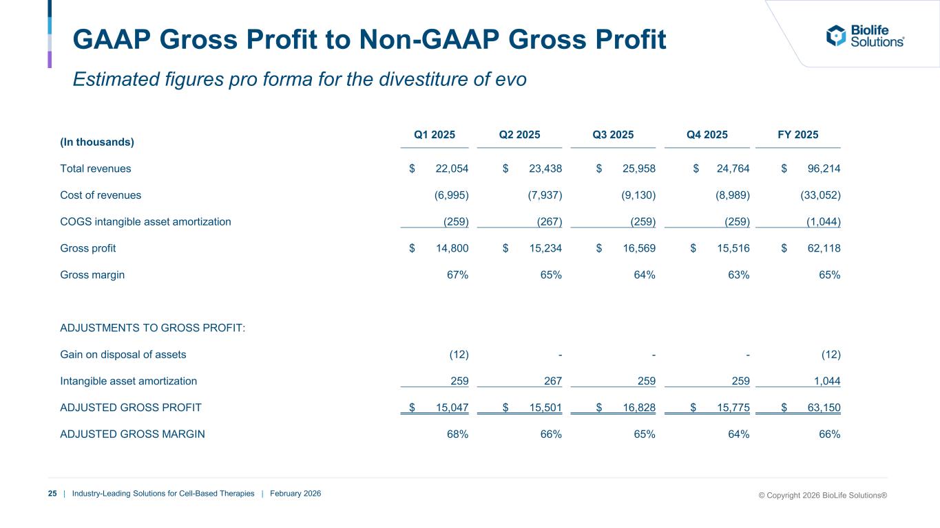24 | Industry-Leading Solutions for Cell-Based Therapies | February 2026 GAAP Gross Profit to Non-GAAP Gross Profit Estimated figures pro forma for the divestiture of evo (In thousands) Q1 2024 Q2 2024 Q3 2024 Q4 2024 FY2024 Total revenues $ 16,485 $ 18,042 $ 19,405 $ 20,715 $ 74,647 Cost of revenues (4,961) (5,905) (5,888) (6,829) (23,583) COGS intangible asset amortization (246) (241) (240) (241) (968) Gross profit $ 11,278 $ 11,896 $ 13,277 $ 13,645 $ 50,096 Gross margin 68% 66% 68% 66% 67% ADJUSTMENTS TO GROSS PROFIT: Inventory reserve costs - - 247 - 247 Gain on disposal of assets - - - 87 87 Intangible asset amortization 246 241 240 241 968 ADJUSTED GROSS PROFIT $ 11,524 $ 12,137 $ 13,764 $ 13,973 $ 51,398 ADJUSTED GROSS MARGIN 70% 67% 71% 67% 69% © Copyright 2026 BioLife Solutions®