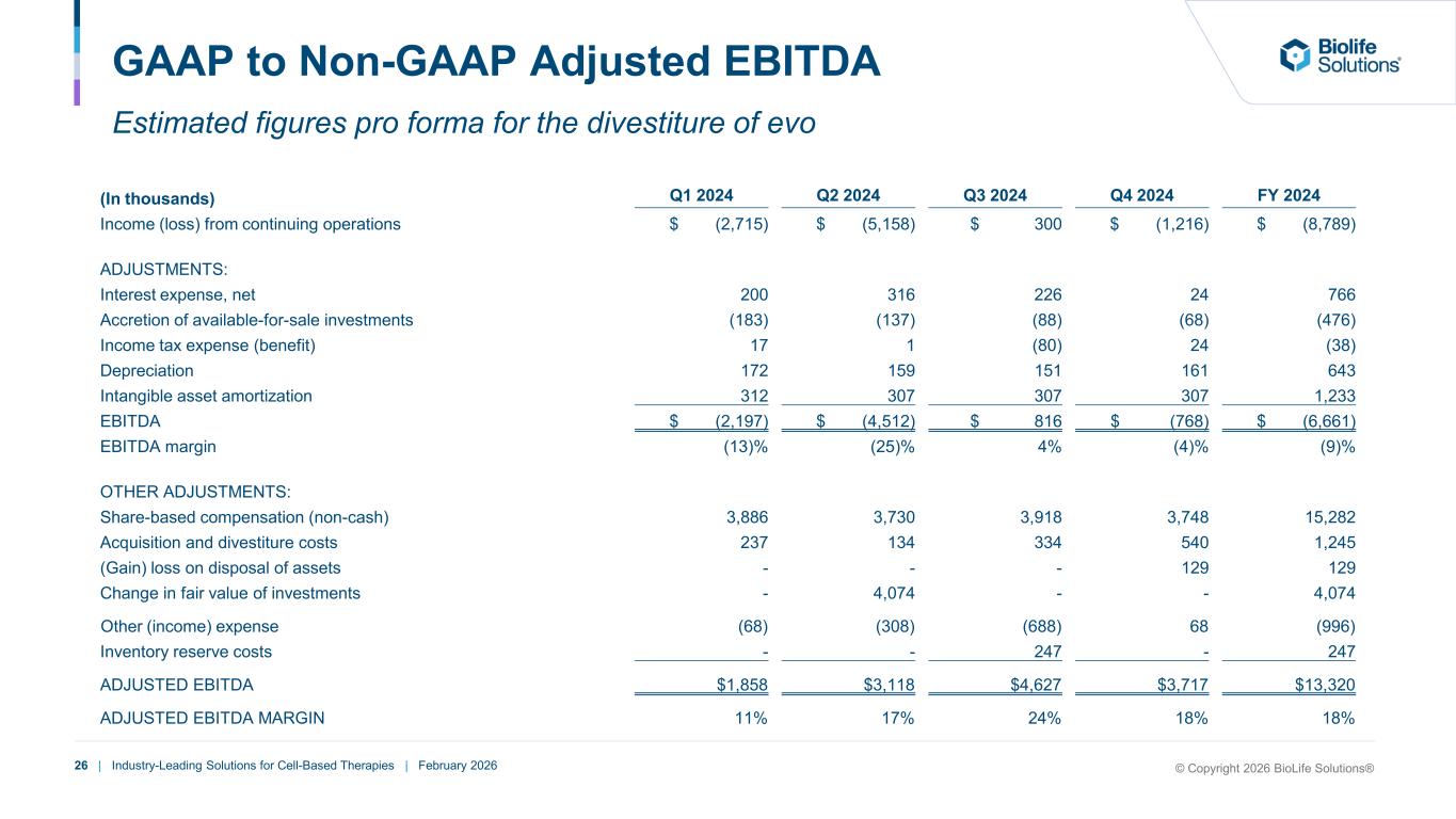 25 | Industry-Leading Solutions for Cell-Based Therapies | February 2026 GAAP Gross Profit to Non-GAAP Gross Profit Estimated figures pro forma for the divestiture of evo (In thousands) Q1 2025 Q2 2025 Q3 2025 Q4 2025 FY 2025 Total revenues $ 22,054 $ 23,438 $ 25,958 $ 24,764 $ 96,214 Cost of revenues (6,995) (7,937) (9,130) (8,989) (33,052) COGS intangible asset amortization (259) (267) (259) (259) (1,044) Gross profit $ 14,800 $ 15,234 $ 16,569 $ 15,516 $ 62,118 Gross margin 67% 65% 64% 63% 65% ADJUSTMENTS TO GROSS PROFIT: Gain on disposal of assets (12) - - - (12) Intangible asset amortization 259 267 259 259 1,044 ADJUSTED GROSS PROFIT $ 15,047 $ 15,501 $ 16,828 $ 15,775 $ 63,150 ADJUSTED GROSS MARGIN 68% 66% 65% 64% 66% © Copyright 2026 BioLife Solutions®