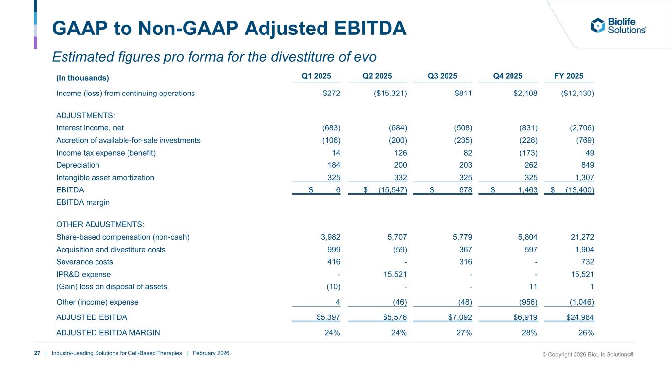 26 | Industry-Leading Solutions for Cell-Based Therapies | February 2026 GAAP to Non-GAAP Adjusted EBITDA Estimated figures pro forma for the divestiture of evo (In thousands) Q1 2024 Q2 2024 Q3 2024 Q4 2024 FY 2024 Income (loss) from continuing operations $ (2,715) $ (5,158) $ 300 $ (1,216) $ (8,789) ADJUSTMENTS: Interest expense, net 200 316 226 24 766 Accretion of available-for-sale investments (183) (137) (88) (68) (476) Income tax expense (benefit) 17 1 (80) 24 (38) Depreciation 172 159 151 161 643 Intangible asset amortization 312 307 307 307 1,233 EBITDA $ (2,197) $ (4,512) $ 816 $ (768) $ (6,661) EBITDA margin (13)% (25)% 4% (4)% (9)% OTHER ADJUSTMENTS: Share-based compensation (non-cash) 3,886 3,730 3,918 3,748 15,282 Acquisition and divestiture costs 237 134 334 540 1,245 (Gain) loss on disposal of assets - - - 129 129 Change in fair value of investments - 4,074 - - 4,074 Other (income) expense (68) (308) (688) 68 (996) Inventory reserve costs - - 247 - 247 ADJUSTED EBITDA $1,858 $3,118 $4,627 $3,717 $13,320 ADJUSTED EBITDA MARGIN 11% 17% 24% 18% 18% © Copyright 2026 BioLife Solutions®