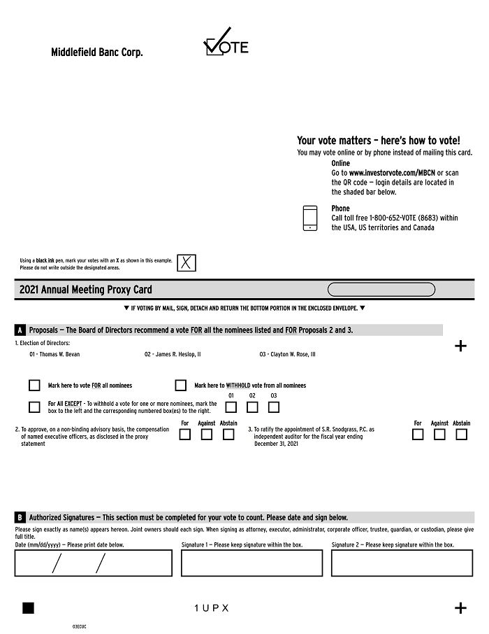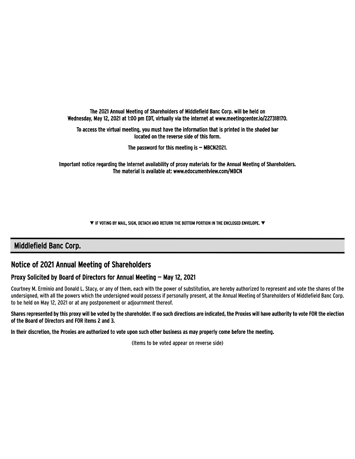 Middlefield Banc Corp. Your vote matters – here’s how to vote! You may vote online or by phone instead of mailing this card. Online Go to www.investorvote.com/MBCN or scan the QR code — login details are located in the shaded bar below. Phone Call toll free 1-800-652-VOTE (8683) within the USA, US territories and Canada Using a black ink pen, mark your votes with an X as shown in this example. Please do not write outside the designated areas. 2021 Annual Meeting Proxy Card q IF VOTING BY MAIL, SIGN, DETACH AND RETURN THE BOTTOM PORTION IN THE ENCLOSED ENVELOPE. q A Proposals — The Board of Directors recommend a vote FOR all the nominees listed and FOR Proposals 2 and 3. 01 - Thomas W. Bevan 02 - James R. Heslop, II 03 - Clayton W. Rose, III + 1. Election of Directors: Mark here to vote FOR all nominees Mark here to WITHHOLD vote from all nominees 01 02 03 For All EXCEPT - To withhold a vote for one or more nominees, mark the box to the left and the corresponding numbered box(es) to the right. For Against Abstain 2. To approve, on a non-binding advisory basis, the compensation of named executive officers, as disclosed in the proxy statement 3. To ratify the appointment of S.R. Snodgrass, P.C. as independent auditor for the fiscal year ending December 31, 2021 For Against Abstain B Authorized Signatures — This section must be completed for your vote to count. Please date and sign below. Please sign exactly as name(s) appears hereon. Joint owners should each sign. When signing as attorney, executor, administrator, corporate officer, trustee, guardian, or custodian, please give full title. Date (mm/dd/yyyy) — Please print date below. Signature 1 — Please keep signature within the box. Signature 2 — Please keep signature within the box. 03ECUC 1 U P X + The 2021 Annual Meeting of Shareholders of Middlefield Banc Corp. will be held on Wednesday, May 12, 2021 at 1:00 pm EDT, virtually via the internet at www.meetingcenter.io/227318170. To access the virtual meeting, you must have the information that is printed in the shaded bar located on the reverse side of this form. The password for this meeting is — MBCN2021. Important notice regarding the Internet availability of proxy materials for the Annual Meeting of Shareholders. The material is available at: www.edocumentview.com/MBCN q IF VOTING BY MAIL, SIGN, DETACH AND RETURN THE BOTTOM PORTION IN THE ENCLOSED ENVELOPE. q Middlefield Banc Corp. Notice of 2021 Annual Meeting of Shareholders Proxy Solicited by Board of Directors for Annual Meeting — May 12, 2021 Courtney M. Erminio and Donald L. Stacy, or any of them, each with the power of substitution, are hereby authorized to represent and vote the shares of the undersigned, with all the powers which the undersigned would possess if personally present, at the Annual Meeting of Shareholders of Middlefield Banc Corp. to be held on May 12, 2021 or at any postponement or adjournment thereof. Shares represented by this proxy will be voted by the shareholder. If no such directions are indicated, the Proxies will have authority to vote FOR the election of the Board of Directors and FOR items 2 and 3. In their discretion, the Proxies are authorized to vote upon such other business as may properly come before the meeting. (Items to be voted appear on reverse side)