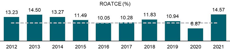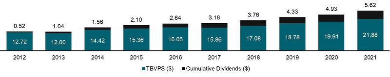 Additionally, over that same ten-year period, the Company has grown its tangible book value per share (on a split-adjusted basis) from $12.05 at December 31, 2011 to $21.88 at December 31, 2021, a compound annual growth rate of 6.2%, while also paying out a total of $5.62 per share in dividends.