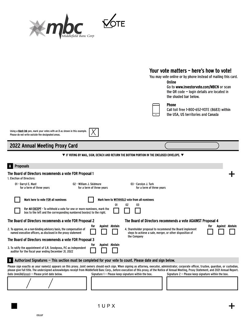 Your vote matters – here’s how to vote! You may vote online or by phone instead of mailing this card. Online Go to www.investorvote.com/MBCN or scan the QR code — login details are located in the shaded bar below. Phone Call toll free 1-800-652-VOTE (8683) within the USA, US territories and Canada Using a black ink pen, mark your votes with an X as shown in this example. Please do not write outside the designated areas. 2022 Annual Meeting Proxy Card q IF VOTING BY MAIL, SIGN, DETACH AND RETURN THE BOTTOM PORTION IN THE ENCLOSED ENVELOPE. q A Proposals The Board of Directors recommends a vote FOR Proposal 1 1. Election of Directors: 01 - Darryl E. Mast 02 - William J. Skidmore 03 - Carolyn J. Turk for a term of three years for a term of three years for a term of three years Mark here to vote FOR all nominees Mark here to WITHHOLD vote from all nominees 01 02 03 For All EXCEPT - To withhold a vote for one or more nominees, mark the box to the left and the corresponding numbered box(es) to the right. The Board of Directors recommends a vote FOR Proposal 2 The Board of Directors recommends a vote AGAINST Proposal 4 2. To approve, on a non-binding advisory basis, the compensation of named executive officers, as disclosed in the proxy statement For Against Abstain 4. Shareholder proposal to recommend the Board implement steps to achieve a sale, merger, or other disposition of the Company For Against Abstain The Board of Directors recommends a vote FOR Proposal 3 For Against Abstain 3. To ratify the appointment of S.R. Snodgrass, P.C as independent auditor for the fiscal year ending December 31, 2022 B Authorized Signatures — This section must be completed for your vote to count. Please date and sign below. Please sign exactly as your name(s) appears on this proxy. Joint owners should each sign. When signing as attorney, executor, administrator, corporate officer, trustee, guardian, or custodian, please give full title. The undersigned acknowledges receipt from Middlefield Banc Corp., before execution of this proxy, of the Notice of Annual Meeting, Proxy Statement, and 2021 Annual Report. Date (mm/dd/yyyy) — Please print date below. Signature 1 — Please keep signature within the box. Signature 2 — Please keep signature within the box.