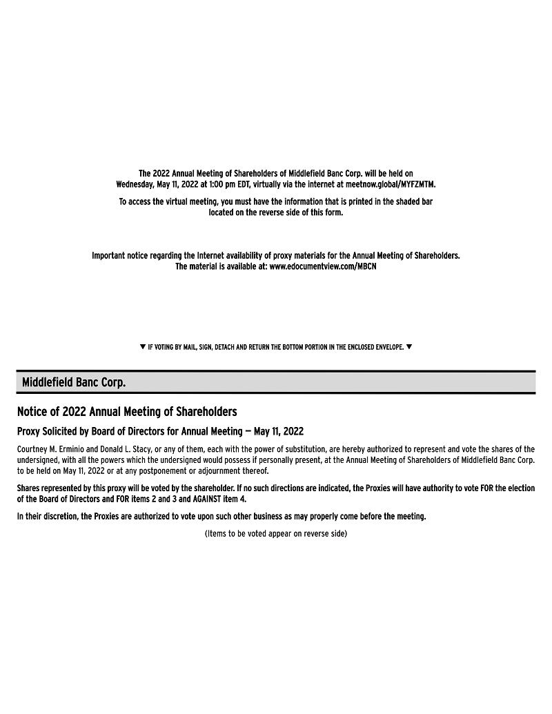 03LLUF 1 U P X + The 2022 Annual Meeting of Shareholders of Middlefield Banc Corp. will be held on Wednesday, May 11, 2022 at 1:00 pm EDT, virtually via the internet at meetnow.global/MYFZMTM. To access the virtual meeting, you must have the information that is printed in the shaded bar located on the reverse side of this form. Important notice regarding the Internet availability of proxy materials for the Annual Meeting of Shareholders. The material is available at: www.edocumentview.com/MBCN q IF VOTING BY MAIL, SIGN, DETACH AND RETURN THE BOTTOM PORTION IN THE ENCLOSED ENVELOPE. q Middlefield Banc Corp. Notice of 2022 Annual Meeting of Shareholders Proxy Solicited by Board of Directors for Annual Meeting — May 11, 2022 Courtney M. Erminio and Donald L. Stacy, or any of them, each with the power of substitution, are hereby authorized to represent and vote the shares of the undersigned, with all the powers which the undersigned would possess if personally present, at the Annual Meeting of Shareholders of Middlefield Banc Corp. to be held on May 11, 2022 or at any postponement or adjournment thereof. Shares represented by this proxy will be voted by the shareholder. If no such directions are indicated, the Proxies will have authority to vote FOR the election of the Board of Directors and FOR items 2 and 3 and AGAINST item 4. In their discretion, the Proxies are authorized to vote upon such other business as may properly come before the meeting. (Items to be voted appear on reverse side)