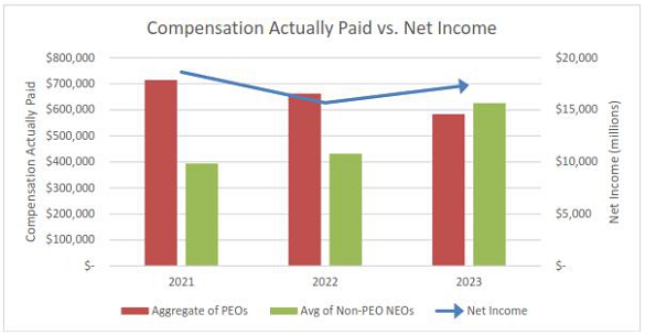 From 2022 to 2023, the SEC-defined “average compensation actually paid” to the other NEOs increased by $186,711 or 43.33%. This increase was caused primarily by the net increase in the year over year fair value of unvested restricted stock awards caused by the increase in the price of Middlefield’s stock from $27.40 per share at December 31, 2022 to $32.37 per share at December 31, 2023.