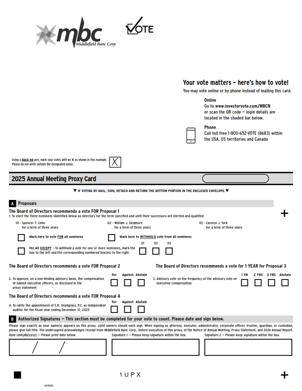 Your vote matters – here’s how to vote! You may vote online or by phone instead of mailing this card. Online Go to www.investorvote.com/MBCN or scan the QR code — login details are located in the shaded bar below. Phone Call toll free 1-800-652-VOTE (8683) within the USA, US territories and Canada Using a black ink pen, mark your votes with an X as shown in this example. Please do not write outside the designated areas. 2025 Annual Meeting Proxy Card q IF VOTING BY MAIL, SIGN, DETACH AND RETURN THE BOTTOM PORTION IN THE ENCLOSED ENVELOPE.q A Proposals The Board of Directors recommends a vote FOR Proposal 1 1. To elect the three nominees identified below as directors for the term specified and until their successors are elected and qualified 01 - Spencer T. Cohn for a term of three years 02 - William J. Skidmore for a term of three years 03 - Carolyn J. Turk for a term of three years Mark here to vote FOR all nominees Mark here to WITHHOLD vote from all nominees 01 02 03 For All EXCEPT - To withhold a vote for one or more nominees, mark the box to the left and the corresponding numbered box(es) to the right. The Board of Directors recommends a vote FOR Proposal 2 The Board of Directors recommends a vote for 1 YEAR for Proposal 3 2. To approve, on a non-binding advisory basis, the compensation of named executive officers, as disclosed in the proxy statement For Against Abstain 3. Advisory vote on the frequency of the advisory vote on executive compensation 1 YR 2 YRS 3 YRS Abstain The Board of Directors recommends a vote FOR Proposal 4 For Against Abstain 4. To ratify the appointment of S.R. Snodgrass, P.C. as independent auditor for the fiscal year ending December 31, 2025 B Authorized Signatures — This section must be completed for your vote to count. Please date and sign below. Please sign exactly as your name(s) appears on this proxy. Joint owners should each sign. When signing as attorney, executor, administrator, corporate officer, trustee, guardian, or custodian, please give full title. The undersigned acknowledges receipt from Middlefield Banc Corp., before execution of this proxy, of the Notice of Annual Meeting, Proxy Statement, and 2024 Annual Report. Date (mm/dd/yyyy) — Please print date below. Signature 1 — Please keep signature within the box. Signature 2 — Please keep signature within the box. 1 U P X 043U4A