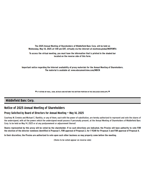 The 2025 Annual Meeting of Shareholders of Middlefield Banc Corp. will be held on Wednesday, May 14, 2025 at 1:00 pm EDT, virtually via the internet at meetnow.global/MSPXWF6 To access the virtual meeting, you must have the information that is printed in the shaded bar located on the reverse side of this form. Important notice regarding the Internet availability of proxy materials for the Annual Meeting of Shareholders. The material is available at: www.edocumentview.com/MBCN q IF VOTING BY MAIL, SIGN, DETACH AND RETURN THE BOTTOM PORTION IN THE ENCLOSED ENVELOPE.q Middlefield Banc Corp. Notice of 2025 Annual Meeting of Shareholders Proxy Solicited by Board of Directors for Annual Meeting — May 14, 2025 Courtney M. Erminio and Michael C. Ranttila, or any of them, each with the power of substitution, are hereby authorized to represent and vote the shares of the undersigned, with all the powers which the undersigned would possess if personally present, at the Annual Meeting of Shareholders of Middlefield Banc Corp. to be held on May 14, 2025 or at any postponement or adjournment thereof. Shares represented by this proxy will be voted by the shareholder. If no such directions are indicated, the Proxies will have authority to vote FOR the election of the director nominees identified in Proposal 1, FOR approval of Proposal 2, for 1 YEAR for Proposal 3 and FOR approval of Proposal 4. In their discretion, the Proxies are authorized to vote upon such other business as may properly come before the meeting. (Items to be voted appear on reverse side)