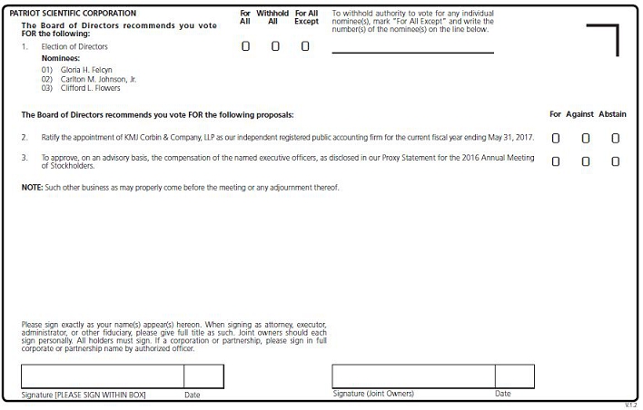 | MEETING ADMISSION: | You are entitled to attend and vote at the annual meeting only if you were a Patriot Scientific Corporation stockholder as of the close of business on March 9, 2017 or hold a valid proxy for the annual meeting. Attendance will be via the live webcast available at www.virtualshareholdermeeting.com/PTSC2017. | |