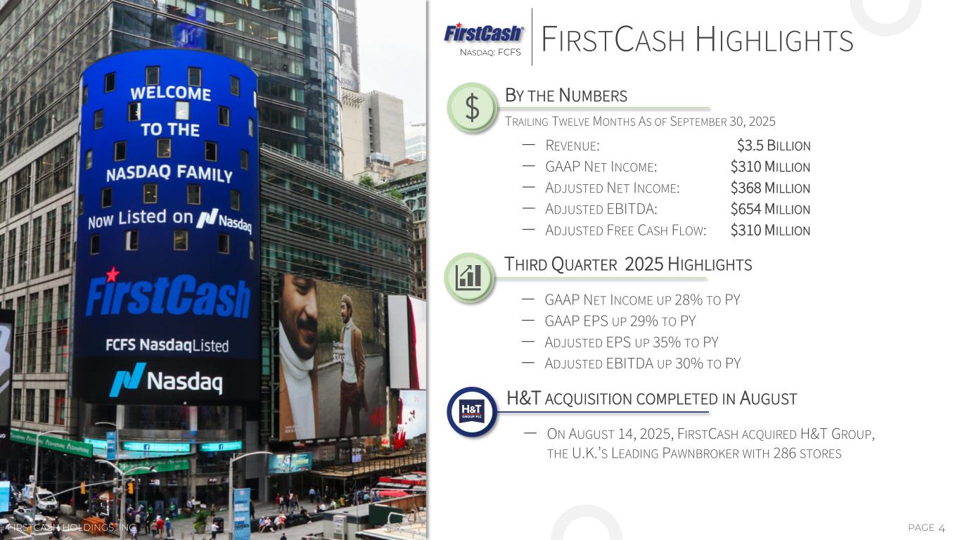 This quarterly presentation contains forward-looking statements about the business, financial condition, outlook and prospects of FirstCash Holdings, Inc. and its wholly owned subsidiaries (together, the “Company”). Forward-looking statements, as that term is defined in the Private Securities Litigation Reform Act of 1995, can be identified by the use of forward-looking terminology such as “believes,” “projects,” “expects,” “may,” “estimates,” “should,” “plans,” “targets,” “intends,” “could, “would,” “anticipates,” “potential,” “confident,” “optimistic,” or the negative thereof, or other variations thereon, or comparable terminology, or by discussions of strategy, objectives, estimates, guidance, expectations, outlook and future plans. Forward-looking statements can also be identified by the fact these statements do not relate strictly to historical or current matters. Rather, forward- looking statements relate to anticipated or expected events, activities, trends or results. Because forward-looking statements relate to matters that have not yet occurred, these statements are inherently subject to risks and uncertainties. While the Company believes the expectations reflected in forward- looking statements are reasonable, there can be no assurances such expectations will prove to be accurate. Security holders are cautioned that such forward-looking statements involve risks and uncertainties. Certain factors may cause results to differ materially from those anticipated by the forwardlooking statements made in this quarterly presentation. Such factors and risks may include, without limitation, risks related to the extensive regulatory environment in which the Company operates, including uncertainty involving the current regulatory environment under the current presidential administration; risks associated with the legal and regulatory proceedings that the Company is a party to or may become a party to in the future; risks related to the Company’s acquisitions, including the failure of the Company’s acquisitions to deliver the estimated value and benefits expected by the Company and the ability of the Company to continue to identify and consummate acquisitions on favorable terms, if at all; risks that the Company may not realize the anticipated benefits of the H&T Group plc (“H&T”) acquisition and risks related to operating in a new jurisdiction; potential changes in consumer behavior and shopping patterns which could impact demand for the Company’s pawn loan, retail, lease-to-own (“LTO”) and retail finance products; labor shortages and increased labor costs; a deterioration in the economic conditions in the United States and Latin America, including as a result of inflation, elevated interest rates and trade policy, which potentially could have an impact on discretionary consumer spending and demand for the Company’s products; currency fluctuations, primarily involving the Mexican peso; competition the Company faces from other retailers and providers of retail payment solutions; the ability of the Company to successfully execute on its business strategies; contraction in sales activity or store closures at merchant partners of the Company’s retail point-of-sale (“POS”) payment solutions business; the ability of the Company’s retail POS payment solutions business to continue to grow its base of merchant partners, including those outside of the furniture vertical; and other risks discussed and described in the Company’s most recent Annual Report on Form 10-K filed with the Securities and Exchange Commission (the “SEC”), including the risks described in Part 1, Item 1A, “Risk Factors” thereof, and other reports filed with the SEC. Many of these risks and uncertainties are beyond the ability of the Company to control, nor can the Company predict, in many cases, all of the risks and uncertainties that could cause its actual results to differ materially from those indicated by the forward-looking statements. The forward-looking statements contained in this quarterly presentation speak only as of the date of this quarterly presentation, and the Company expressly disclaims any obligation or undertaking to report any updates or revisions to any such statement to reflect any change in the Company’s expectations or any change in events, conditions or circumstances on which any such statement is based, except as required by law. 2PAGE CAUTIONARY STATEMENT REGARDING FORWARD-LOOKING STATEMENTSNASDAQ: FCFS FIRSTCASH HOLDINGS, INC. INVESTORS.FIRSTCASH.COM
