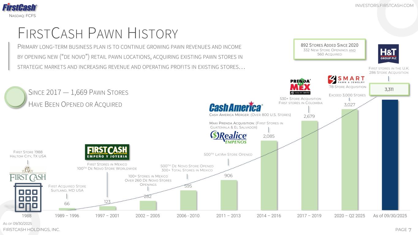 85% PAWN (U.S., LATAM & U.K.) With over 12 million individual pre- owned items sold annually, we believe we are one of the largest resellers of recycled consumer products in the Americas… BRANDS OUR CUSTOMERS KNOW AND TRUST PAWN OVERVIEW FIRSTCASH IS THE LEADING INTERNATIONAL OPERATOR OF PAWN STORES WITH MORE THAN 3,300 RETAIL PAWN LOCATIONS AND OVER 21,000 EMPLOYEES IN 29 U.S. STATES, THE DISTRICT OF COLUMBIA , FOUR COUNTRIES IN LATIN AMERICA (INCLUDING MEXICO, GUATEMALA, COLOMBIA, EL SALVADOR), AND THE UNITED KINGDOM… Provide quick and convenient retail and credit solutions to unbanked, under-banked and credit-challenged customers MISSION Grow revenues and income by opening new retail pawn locations, acquiring existing pawn stores in strategic markets and increasing revenue and operating profits in existing stores BUSINESS STRATEGY Pawn stores are neighborhood-based retail locations that buy and sell pre-owned consumer products such as jewelry, electronics, tools, appliances, sporting goods and musical instruments, and make small consumer pawn loans PAWN INDUSTRY Pawn National Pawn Trust, Value, Satisfaction. Guaranteed SM 6PAGEFIRSTCASH HOLDINGS, INC. NASDAQ: FCFS INVESTORS.FIRSTCASH.COM PAWN OPERATIONS DRIVE EARNINGS 15% RETAIL POS PAYMENT SOLUTIONS Forecast Segment Contribution