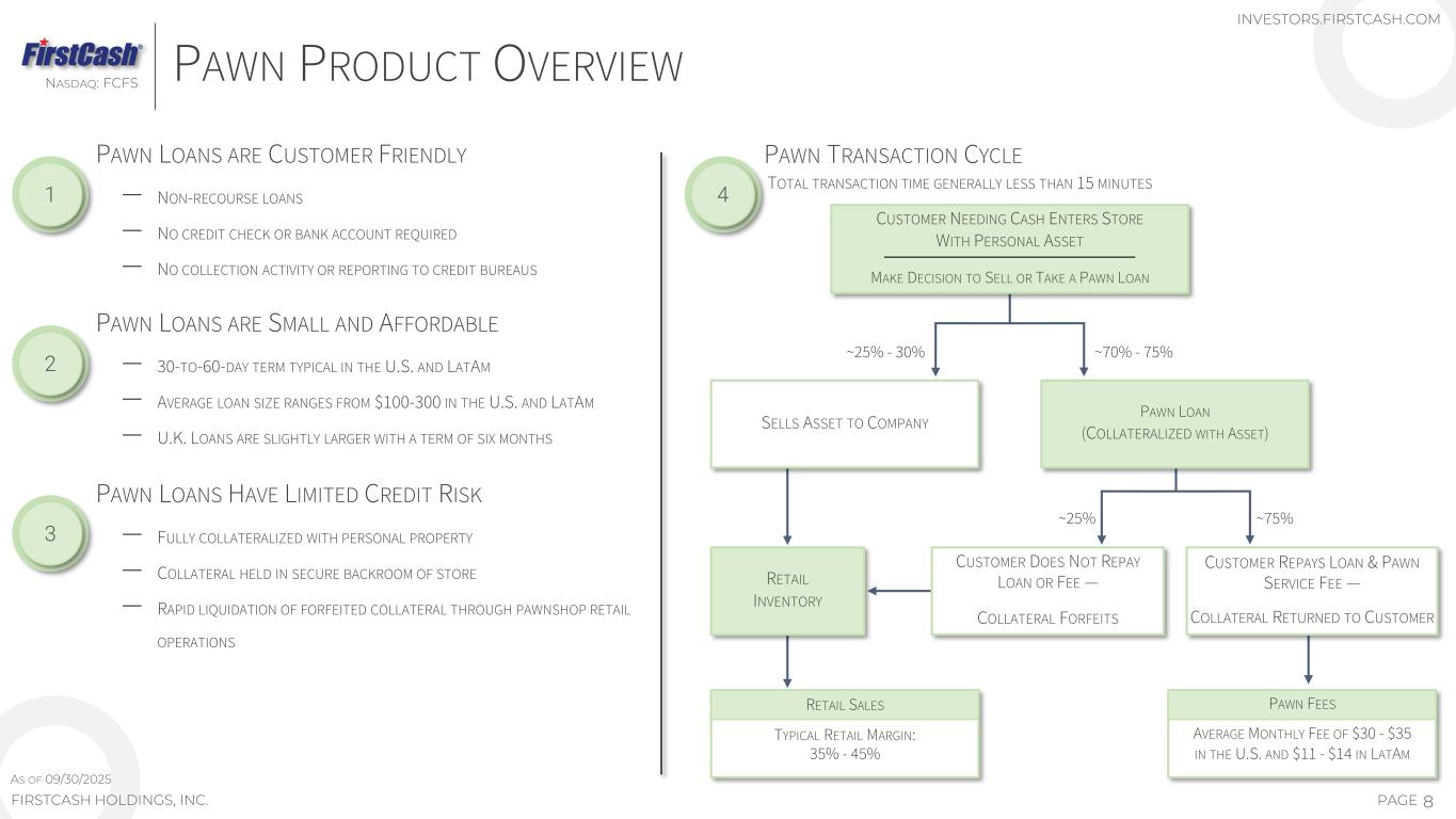 66 123 282 595 906 2,085 2,679 3,027 1988 1989 – 1996 1997 – 2001 2002 – 2005 2006 - 2010 2011 – 2013 2014 – 2016 2017 – 2019 2020 – Q2 2025 As of 09/30/2025 FIRSTCASH PAWN HISTORY PRIMARY LONG-TERM BUSINESS PLAN IS TO CONTINUE GROWING PAWN REVENUES AND INCOME BY OPENING NEW (“DE NOVO”) RETAIL PAWN LOCATIONS, ACQUIRING EXISTING PAWN STORES IN STRATEGIC MARKETS AND INCREASING REVENUE AND OPERATING PROFITS IN EXISTING STORES… 7PAGEFIRSTCASH HOLDINGS, INC. NASDAQ: FCFS FIRST ACQUIRED STORE SUITLAND, MD USA FIRST STORE 1988 HALTOM CITY, TX USA 100+ STORES IN MEXICO OVER 260 DE NOVO STORES OPENINGS 500TH LATAM STORE OPENED FIRST STORES IN MEXICO 100TH DE NOVO STORE WORLDWIDE 500TH DE NOVO STORE OPENED 300+ TOTAL STORES IN MEXICO CASH AMERICA MERGER: (OVER 800 U.S. STORES) MAXI PRENDA ACQUISITION: (FIRST STORES IN GUATEMALA & EL SALVADOR) 530+ STORE ACQUISITION FIRST STORES IN COLOMBIA 892 STORES ADDED SINCE 2020 332 NEW STORE OPENINGS AND 560 ACQUIRED SINCE 2017 — 1,669 PAWN STORES HAVE BEEN OPENED OR ACQUIRED 3,311 78 STORE ACQUISITION EXCEED 3,000 STORES INVESTORS.FIRSTCASH.COM AS OF 09/30/2025 FIRST STORES IN THE U.K. 286 STORE ACQUISITION