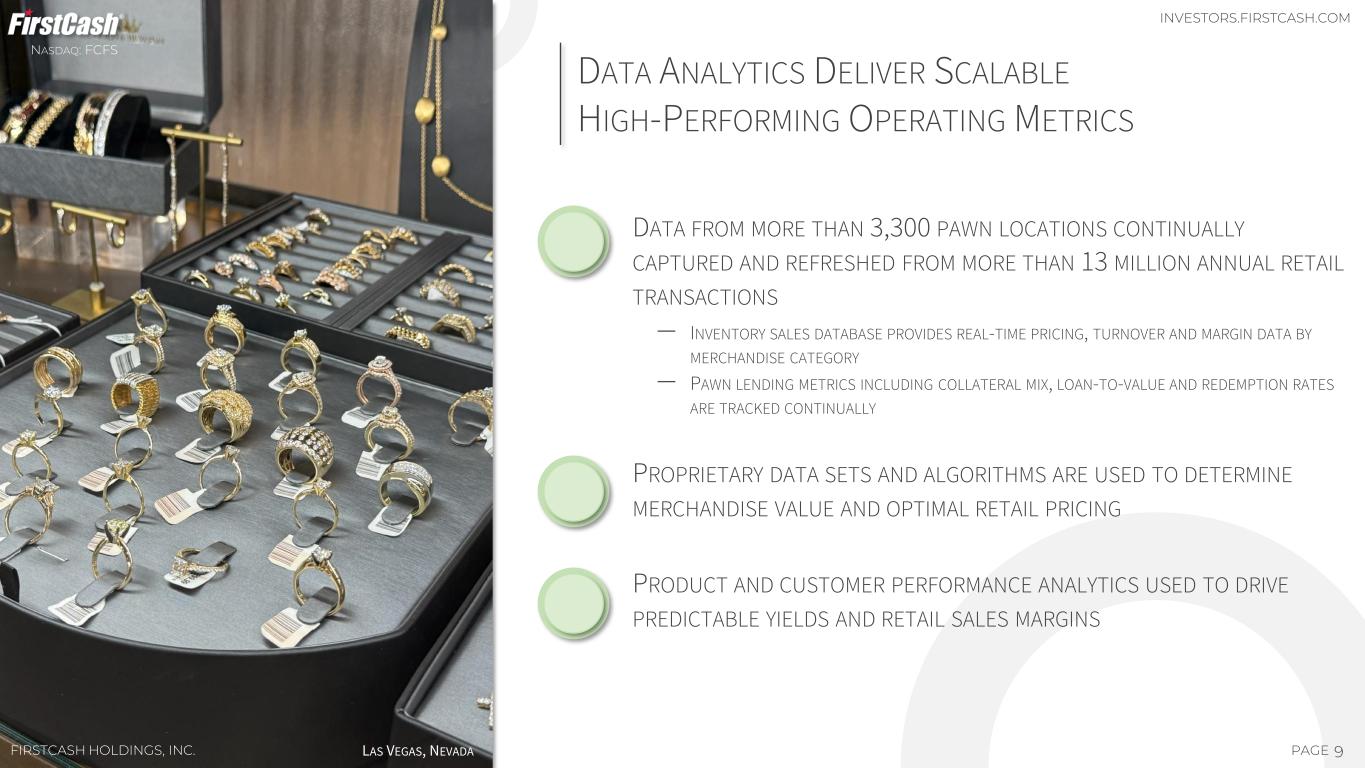 1 2 3 4 8PAGE PAWN PRODUCT OVERVIEWNASDAQ: FCFS FIRSTCASH HOLDINGS, INC. PAWN LOANS ARE CUSTOMER FRIENDLY ‒ NON-RECOURSE LOANS ‒ NO CREDIT CHECK OR BANK ACCOUNT REQUIRED ‒ NO COLLECTION ACTIVITY OR REPORTING TO CREDIT BUREAUS PAWN LOANS ARE SMALL AND AFFORDABLE ‒ 30-TO-60-DAY TERM TYPICAL IN THE U.S. AND LATAM ‒ AVERAGE LOAN SIZE RANGES FROM $100-300 IN THE U.S. AND LATAM ‒ U.K. LOANS ARE SLIGHTLY LARGER WITH A TERM OF SIX MONTHS PAWN TRANSACTION CYCLE TOTAL TRANSACTION TIME GENERALLY LESS THAN 15 MINUTES PAWN LOANS HAVE LIMITED CREDIT RISK ‒ FULLY COLLATERALIZED WITH PERSONAL PROPERTY ‒ COLLATERAL HELD IN SECURE BACKROOM OF STORE ‒ RAPID LIQUIDATION OF FORFEITED COLLATERAL THROUGH PAWNSHOP RETAIL OPERATIONS TYPICAL RETAIL MARGIN: 35% - 45% AVERAGE MONTHLY FEE OF $30 - $35 IN THE U.S. AND $11 - $14 IN LATAM CUSTOMER DOES NOT REPAY LOAN OR FEE — COLLATERAL FORFEITS CUSTOMER REPAYS LOAN & PAWN SERVICE FEE — COLLATERAL RETURNED TO CUSTOMER ~25% - 30% ~70% - 75% CUSTOMER NEEDING CASH ENTERS STORE WITH PERSONAL ASSET MAKE DECISION TO SELL OR TAKE A PAWN LOAN ~25% ~75% SELLS ASSET TO COMPANY PAWN LOAN (COLLATERALIZED WITH ASSET) RETAIL INVENTORY RETAIL SALES PAWN FEES INVESTORS.FIRSTCASH.COM AS OF 09/30/2025
