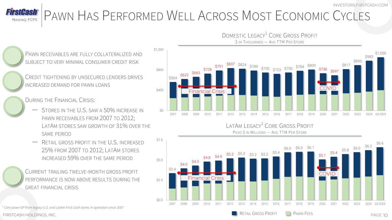 DATA FROM MORE THAN 3,300 PAWN LOCATIONS CONTINUALLY CAPTURED AND REFRESHED FROM MORE THAN 13 MILLION ANNUAL RETAIL TRANSACTIONS ‒ INVENTORY SALES DATABASE PROVIDES REAL-TIME PRICING, TURNOVER AND MARGIN DATA BY MERCHANDISE CATEGORY ‒ PAWN LENDING METRICS INCLUDING COLLATERAL MIX, LOAN-TO-VALUE AND REDEMPTION RATES ARE TRACKED CONTINUALLY PROPRIETARY DATA SETS AND ALGORITHMS ARE USED TO DETERMINE MERCHANDISE VALUE AND OPTIMAL RETAIL PRICING PRODUCT AND CUSTOMER PERFORMANCE ANALYTICS USED TO DRIVE PREDICTABLE YIELDS AND RETAIL SALES MARGINS 9PAGEFIRSTCASH HOLDINGS, INC. NASDAQ: FCFS INVESTORS.FIRSTCASH.COM DATA ANALYTICS DELIVER SCALABLE HIGH-PERFORMING OPERATING METRICS LAS VEGAS, NEVADA