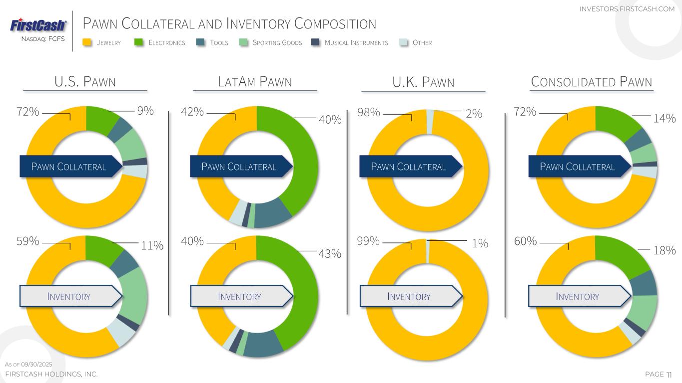 PAWN HAS PERFORMED WELL ACROSS MOST ECONOMIC CYCLES 10PAGE NASDAQ: FCFS FIRSTCASH HOLDINGS, INC. $3.4 $4.0 $4.3 $4.8 $4.9 $5.2 $5.3 $5.2 $5.2 $5.4 $6.0 $6.0 $6.1 $5.1 $5.4 $5.8 $6.0 $6.2 $6.6 $0.0 $2.5 $5.0 $7.5 2007 2008 2009 2010 2011 2012 2013 2014 2015 2016 2017 2018 2019 2020 2021 2022 2023 2024 Q3 2025 $564 $622 $665 $728 $791 $837 $824 $789 $750 $723 $750 $784 $809 $736 $697 $817 $895 $983 $1,050 $0 $400 $800 $1,200 2007 2008 2009 2010 2011 2012 2013 2014 2015 2016 2017 2018 2019 2020 2021 2022 2023 2024 Q3 2025 Financial Crisis COVID PAWN RECEIVABLES ARE FULLY COLLATERALIZED AND SUBJECT TO VERY MINIMAL CONSUMER CREDIT RISK CREDIT TIGHTENING BY UNSECURED LENDERS DRIVES INCREASED DEMAND FOR PAWN LOANS DURING THE FINANCIAL CRISIS: ‒ STORES IN THE U.S. SAW A 50% INCREASE IN PAWN RECEIVABLES FROM 2007 TO 2012; LATAM STORES SAW GROWTH OF 31% OVER THE SAME PERIOD ‒ RETAIL GROSS PROFIT IN THE U.S. INCREASED 25% FROM 2007 TO 2012; LATAM STORES INCREASED 59% OVER THE SAME PERIOD CURRENT TRAILING TWELVE-MONTH GROSS PROFIT PERFORMANCE IS NOW ABOVE RESULTS DURING THE GREAT FINANCIAL CRISIS LATAM LEGACY 1 CORE GROSS PROFIT PESO $ IN MILLIONS — AVG TTM PER STORE DOMESTIC LEGACY 1 CORE GROSS PROFIT $ IN THOUSANDS — AVG TTM PER STORE 1 Core pawn GP from legacy U.S. and LatAm First Cash stores in operation since 2007 PAWN FEESRETAIL GROSS PROFIT Financial Crisis COVID INVESTORS.FIRSTCASH.COM
