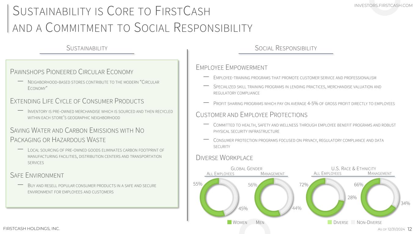 PAWNSHOPS PIONEERED CIRCULAR ECONOMY ‒ NEIGHBORHOOD-BASED STORES CONTRIBUTE TO THE MODERN “CIRCULAR ECONOMY” EXTENDING LIFE CYCLE OF CONSUMER PRODUCTS – INVENTORY IS PRE-OWNED MERCHANDISE WHICH IS SOURCED AND THEN RECYCLED WITHIN EACH STORE’S GEOGRAPHIC NEIGHBORHOOD SAVING WATER AND CARBON EMISSIONS WITH NO PACKAGING OR HAZARDOUS WASTE ‒ LOCAL SOURCING OF PRE-OWNED GOODS ELIMINATES CARBON FOOTPRINT OF MANUFACTURING FACILITIES, DISTRIBUTION CENTERS AND TRANSPORTATION SERVICES SAFE ENVIRONMENT ‒ BUY AND RESELL POPULAR CONSUMER PRODUCTS IN A SAFE AND SECURE ENVIRONMENT FOR EMPLOYEES AND CUSTOMERS EMPLOYEE EMPOWERMENT ‒ EMPLOYEE-TRAINING PROGRAMS THAT PROMOTE CUSTOMER SERVICE AND PROFESSIONALISM ‒ SPECIALIZED SKILL TRAINING PROGRAMS IN LENDING PRACTICES, MERCHANDISE VALUATION AND REGULATORY COMPLIANCE ‒ PROFIT SHARING PROGRAMS WHICH PAY ON AVERAGE 4-5% OF GROSS PROFIT DIRECTLY TO EMPLOYEES CUSTOMER AND EMPLOYEE PROTECTIONS – COMMITTED TO HEALTH, SAFETY AND WELLNESS THROUGH EMPLOYEE BENEFIT PROGRAMS AND ROBUST PHYSICAL SECURITY INFRASTRUCTURE – CONSUMER PROTECTION PROGRAMS FOCUSED ON PRIVACY, REGULATORY COMPLIANCE AND DATA SECURITY DIVERSE WORKPLACE 55% 45% ALL EMPLOYEES MANAGEMENT GLOBAL GENDER WOMEN MEN 56% 44% 66% 34% 72% 28% ALL EMPLOYEES MANAGEMENT U.S. RACE & ETHNICITY DIVERSE NON-DIVERSE SUSTAINABILITY IS CORE TO FIRSTCASH AND A COMMITMENT TO SOCIAL RESPONSIBILITY SUSTAINABILITY SOCIAL RESPONSIBILITY INVESTORS.FIRSTCASH.COM 12FIRSTCASH HOLDINGS, INC. AS OF 12/31/2024
