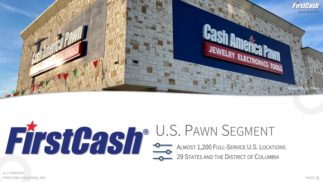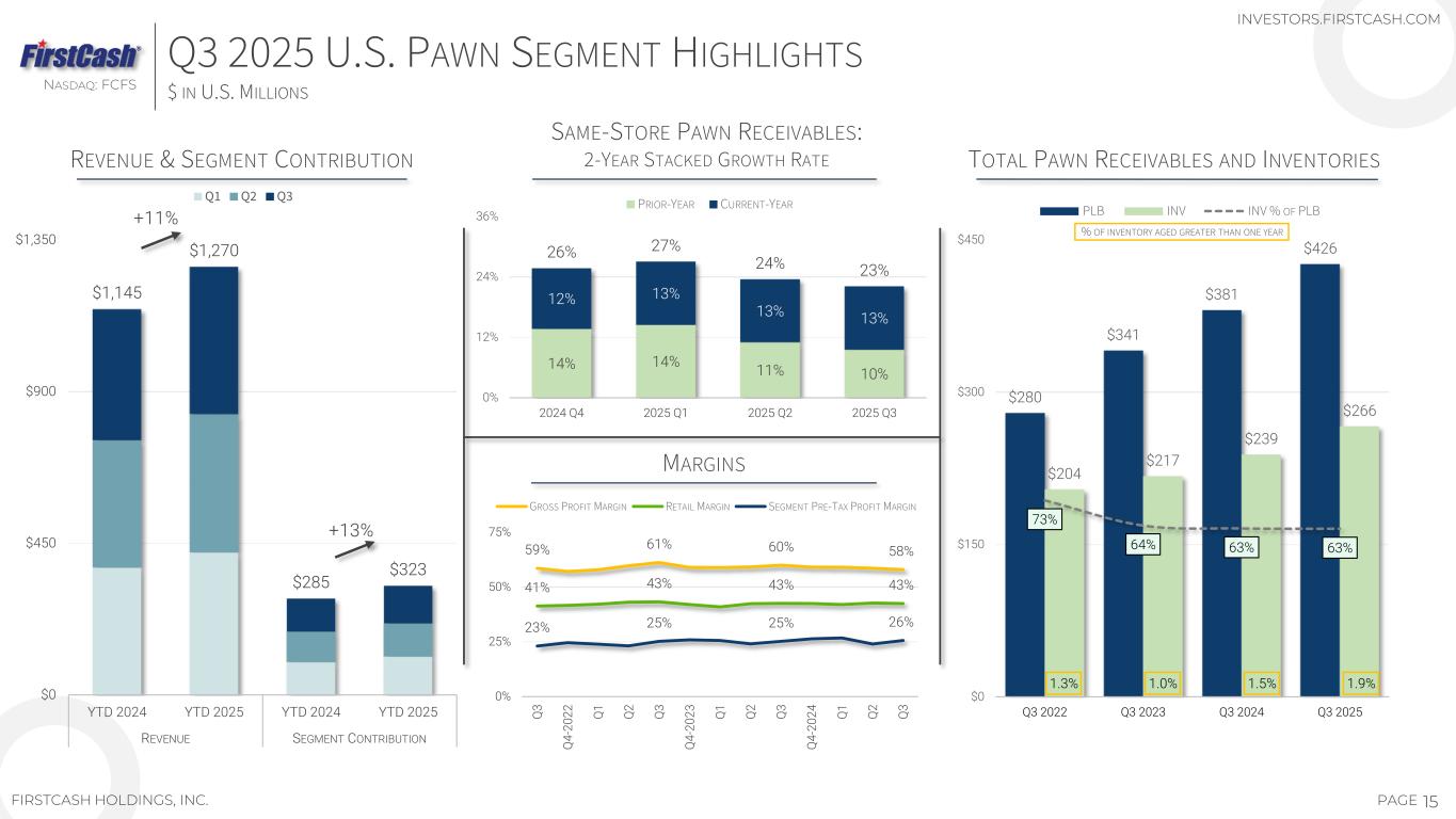 14PAGE U.S. PAWN SEGMENT 29 U.S. STATES AND THE DISTRICT OF COLUMBIA NASDAQ: FCFS FIRSTCASH HOLDINGS, INC. INVESTORS.FIRSTCASH.COM 27 27 22 47 30 96 29 12 3 30 57 79 126 156 252 281 293 0 120 240 360 2017 2018 2019 2020 2021 2022 2023 2024 YTD 2025 U.S. PAWN MARKET IS LARGE AND HIGHLY FRAGMENTED — OVER 12,000 ESTIMATED PAWN SHOPS IN U.S. FIRSTCASH LOCATIONS FOCUSED IN MARKETS WITH: ‒ GROWING POPULATIONS ‒ FAVORABLE CUSTOMER DEMOGRAPHICS ‒ STABLE REGULATIONS ‒ OPPORTUNITIES TO FURTHER ADD LOCATIONS NV AK WA LA UT NE AZ CO TX MO OK IL IN OH GAAL FL KY TN NC VA WY SC 30 30 46 491 6 1 4 22 1 19 39 29 20 23 70 56 4622 86 49 23 13 27 MD 28 DC 2 FORT WORTH, TX FIRSTCASH HEADQUARTERS 2 MS 5 3 3 1 OR ND SD IA 1,197 LOCATIONS CONTINUED GROWTH OPPORTUNITIES AS OF 10/31/2025 STORES ADDED EACH YEAR CUMULATIVE U.S. STORE ADDITIONS (SINCE CASH AMERICA MERGER)