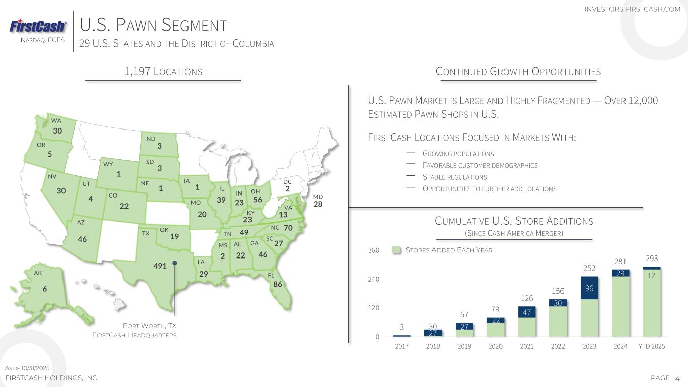 NASDAQ: FCFS 13PAGEFIRSTCASH HOLDINGS, INC. U.S. PAWN SEGMENT ALMOST 1,200 FULL-SERVICE U.S. LOCATIONS 29 STATES AND THE DISTRICT OF COLUMBIA AS OF 09/30/2025 GRAND PRAIRIE, TEXAS