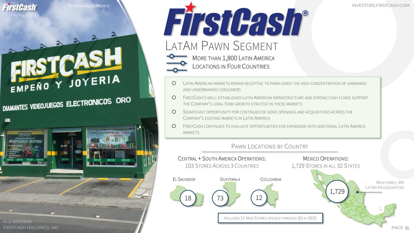 $280 $341 $381 $426 $204 $217 $239 $266 73% 64% 63% 63% $0 $150 $300 $450 Q3 2022 Q3 2023 Q3 2024 Q3 2025 PLB INV INV % OF PLB $1,145 $1,270 $285 $323 $0 $450 $900 $1,350 YTD 2024 YTD 2025 YTD 2024 YTD 2025 REVENUE SEGMENT CONTRIBUTION Q1 Q2 Q3 15PAGE Q3 2025 U.S. PAWN SEGMENT HIGHLIGHTS $ IN U.S. MILLIONS NASDAQ: FCFS FIRSTCASH HOLDINGS, INC. +11% 14% 14% 11% 10% 12% 13% 13% 13% 26% 27% 24% 23% 0% 12% 24% 36% 2024 Q4 2025 Q1 2025 Q2 2025 Q3 PRIOR-YEAR CURRENT-YEAR REVENUE & SEGMENT CONTRIBUTION SAME-STORE PAWN RECEIVABLES: 2-YEAR STACKED GROWTH RATE 59% 61% 60% 58% 41% 43% 43% 43% 23% 25% 25% 26% 0% 25% 50% 75% Q 3 Q 4 -2 0 2 2 Q 1 Q 2 Q 3 Q 4 -2 0 2 3 Q 1 Q 2 Q 3 Q 4 -2 0 2 4 Q 1 Q 2 Q 3 GROSS PROFIT MARGIN RETAIL MARGIN SEGMENT PRE-TAX PROFIT MARGIN TOTAL PAWN RECEIVABLES AND INVENTORIES MARGINS INVESTORS.FIRSTCASH.COM +13% 1.3% 1.0% 1.9%1.5% % OF INVENTORY AGED GREATER THAN ONE YEAR