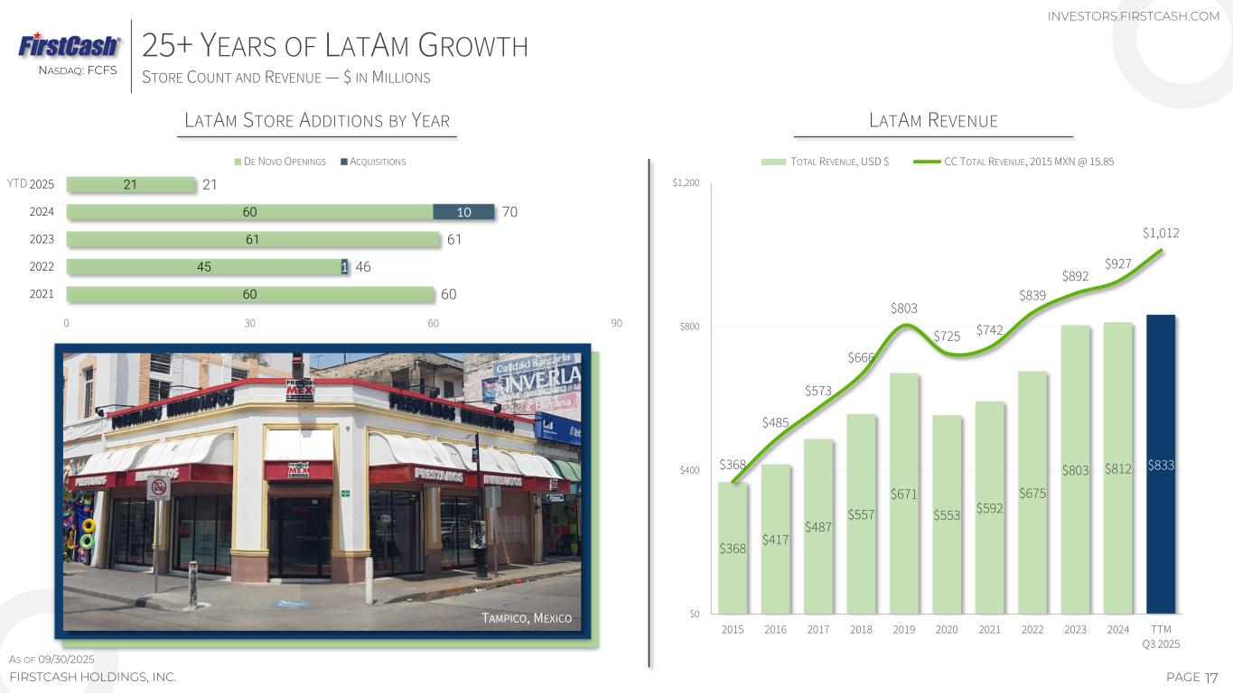 16PAGEFIRSTCASH HOLDINGS, INC. TECAMACHALCO, MEXICO NASDAQ: FCFS INVESTORS.FIRSTCASH.COM LATAM PAWN SEGMENT MORE THAN 1,800 LATIN AMERICA LOCATIONS IN FOUR COUNTRIES o LATIN AMERICAN MARKETS REMAIN RECEPTIVE TO PAWN GIVEN THE HIGH CONCENTRATION OF UNBANKED AND UNDERBANKED CONSUMERS o FIRSTCASH’S WELL-ESTABLISHED LATIN AMERICAN INFRASTRUCTURE AND STRONG CASH FLOWS SUPPORT THE COMPANY’S LONG-TERM GROWTH STRATEGY IN THESE MARKETS o SIGNIFICANT OPPORTUNITY FOR CONTINUED DE NOVO OPENINGS AND ACQUISITIONS ACROSS THE COMPANY’S EXISTING MARKETS IN LATIN AMERICA o FIRSTCASH CONTINUES TO EVALUATE OPPORTUNITIES FOR EXPANSION INTO ADDITIONAL LATIN AMERICA MARKETS EL SALVADOR 18 GUATEMALA 73 COLOMBIA 12 MEXICO OPERATIONS: 1,729 STORES IN ALL 32 STATES 1,729 PAWN LOCATIONS BY COUNTRY CENTRAL + SOUTH AMERICA OPERATIONS: 103 STORES ACROSS 3 COUNTRIES MONTERREY, MX LATAM HEADQUARTERS INCLUDES 21 NEW STORES OPENED THROUGH Q3 IN 2025 AS OF 09/30/2025