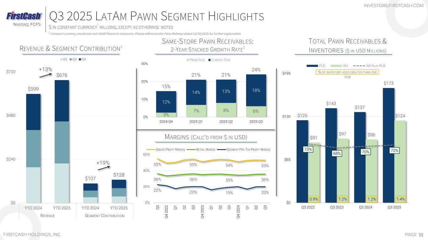 17PAGE NASDAQ: FCFS FIRSTCASH HOLDINGS, INC. 25+ YEARS OF LATAM GROWTH STORE COUNT AND REVENUE — $ IN MILLIONS INVESTORS.FIRSTCASH.COM 60 45 61 60 21 1 10 60 46 61 70 21 0 30 60 90 2021 2022 2023 2024 2025 DE NOVO OPENINGS ACQUISITIONS $368 $417 $487 $557 $671 $553 $592 $675 $803 $812 $833 $368 $485 $573 $666 $803 $725 $742 $839 $892 $927 $1,012 $0 $400 $800 $1,200 2015 2016 2017 2018 2019 2020 2021 2022 2023 2024 TTM Q3 2025 TOTAL REVENUE, USD $ CC TOTAL REVENUE, 2015 MXN @ 15.85 LATAM STORE ADDITIONS BY YEAR LATAM REVENUE TAMPICO, MEXICO AS OF 09/30/2025 YTD