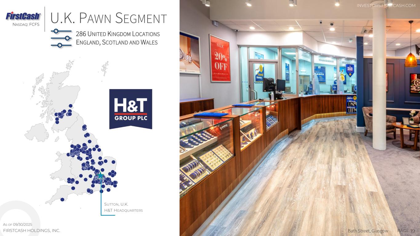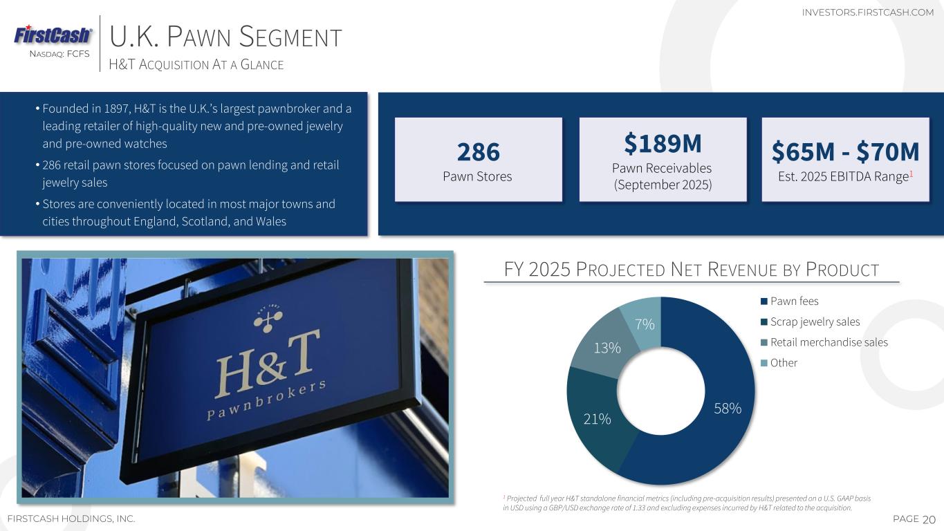 19PAGEFIRSTCASH HOLDINGS, INC. U.K. PAWN SEGMENT INVESTORS.FIRSTCASH.COM 286 UNITED KINGDOM LOCATIONS ENGLAND, SCOTLAND AND WALES SUTTON, U.K. H&T HEADQUARTERS Bath Street, Glasgow NASDAQ: FCFS AS OF 09/30/2025