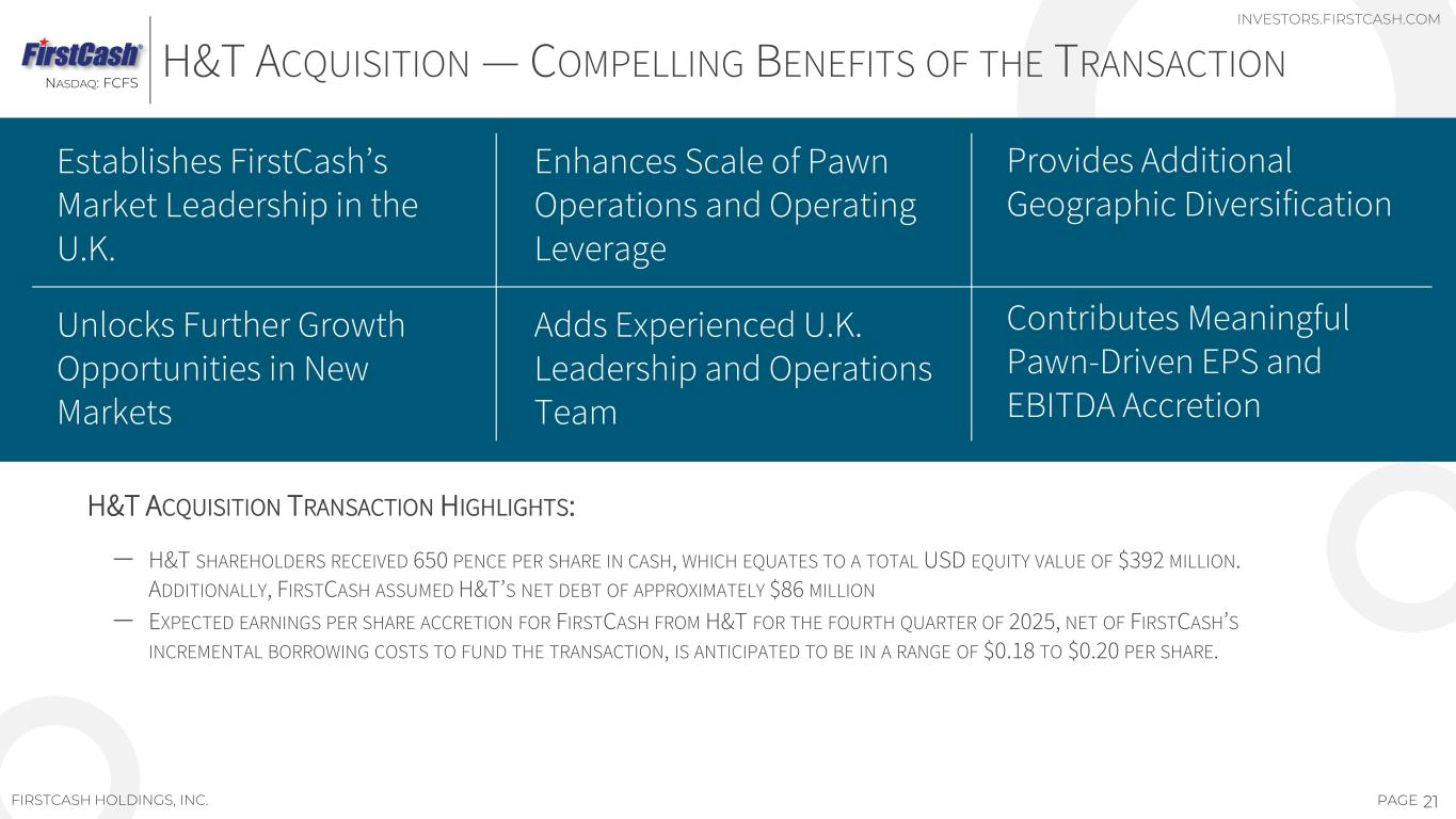 20PAGEFIRSTCASH HOLDINGS, INC. TAMPICO, MEXICO INVESTORS.FIRSTCASH.COM NASDAQ: FCFS • Founded in 1897, H&T is the U.K.’s largest pawnbroker and a leading retailer of high-quality new and pre-owned jewelry and pre-owned watches • 286 retail pawn stores focused on pawn lending and retail jewelry sales • Stores are conveniently located in most major towns and cities throughout England, Scotland, and Wales $189M Pawn Receivables (September 2025) $65M - $70M Est. 2025 EBITDA Range1 286 Pawn Stores FY 2025 PROJECTED NET REVENUE BY PRODU T 58% 21% 13% 7% Pawn fees Scrap jewelry sales Retail merchandise sales Other U.K. PAWN SEGMENT H&T ACQUISITION AT A GLANCE 1 Projected full year H&T standalone financial metrics (including pre-acquisition results) presented on a U.S. GAAP basis in USD using a GBP/USD exchange rate of 1.33 and excluding expenses incurred by H&T related to the acquisition.
