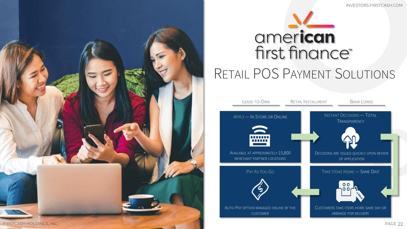 22PAGEFIRSTCASH HOLDINGS, INC. TAMPICO, MEXICO RETAIL POS PAYMENT SOLUTIONS INVESTORS.FIRSTCASH.COM LEASE-TO-OWN BANK LOANSRETAIL INSTALLMENT CUSTOMERS TAKE ITEMS HOME SAME DAY OR ARRANGE FOR DELIVERY TAKE ITEMS HOME — SAME DAY! AVAILABLE AT APPROXIMATELY 15,800 MERCHANT PARTNER LOCATIONS APPLY — IN STORE OR ONLINE DECISIONS ARE ISSUED QUICKLY UPON REVIEW OF APPLICATION INSTANT DECISIONS — TOTAL TRANSPARENCY AUTO-PAY OPTION MANAGED ONLINE BY THE CUSTOMER PAY AS YOU GO