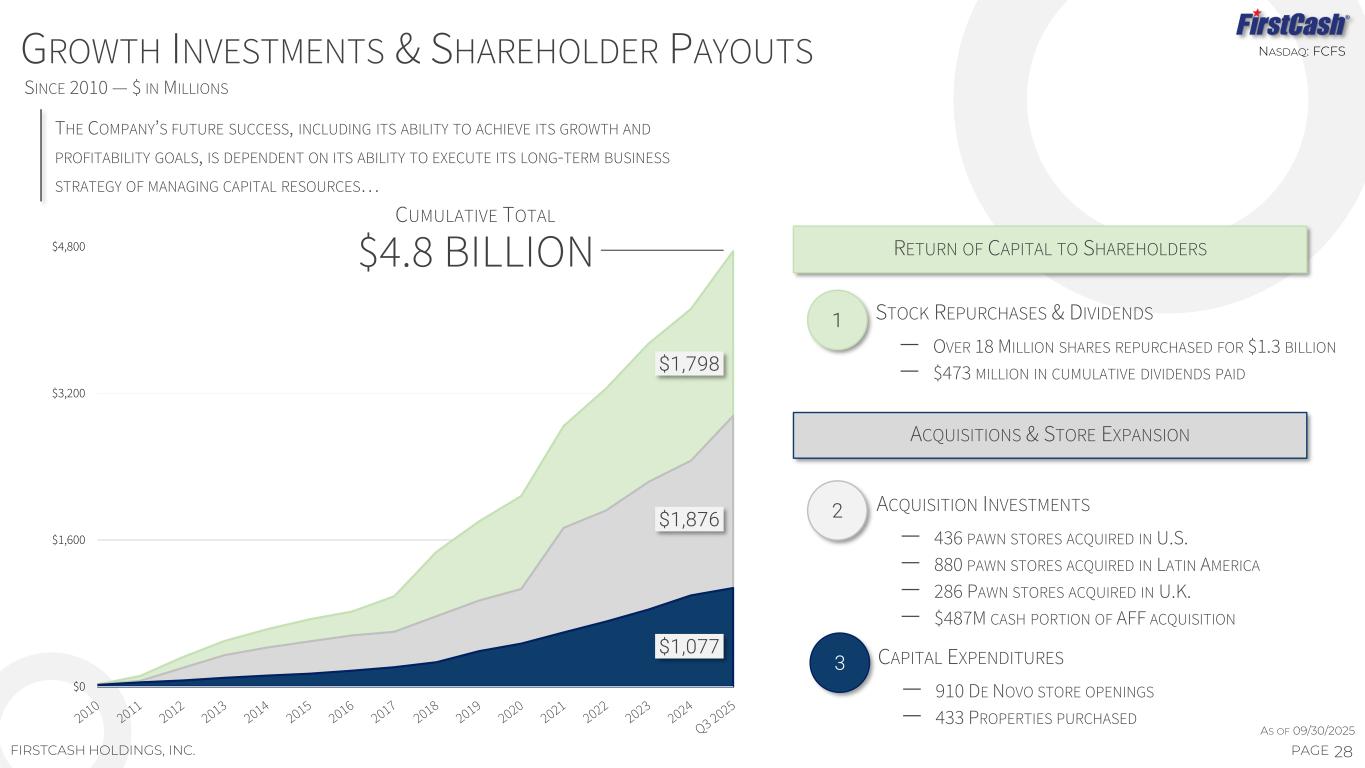 $275 $114 $107 $50 $158 $114 $85 $90 $93 $368 $482 $588 $638 $796 $910 $995 $1,085 1,616 4,959 6,264 7,691 8,379 10,583 11,831 12,552 13,307 0 6,000 12,000 18,000 24,000 $0 $300 $600 $900 $1,200 2017 2018 2019 2020 2021 2022 2023 2024 YTD 09/30/25 C U M U LA T IV E C O U N T S H A R E R E P U R C H A S E D C U M U LA T IV E S H A R E R E P U R C H A S E S ( M IL LI O N S ) ANNUAL REPURCHASES – CURRENT YEAR CUMULATIVE COUNT SHARES REPURCHASED $0.125 $0.19 $0.22 $0.25 $0.27 $0.27 $0.30 $0.33 $0.35 $0.38 $0.125 $0.19 $0.22 $0.25 $0.27 $0.30 $0.30 $0.33 $0.35 $0.38 $0.125 $0.19 $0.22 $0.25 $0.27 $0.30 $0.33 $0.35 $0.38 $0.42 $0.19 $0.20 $0.25 $0.27 $0.27 $0.30 $0.33 $0.35 $0.38 $0.42 $0.57 $0.77 $0.91 $1.02 $1.08 $1.17 $1.26 $1.36 $1.46 $1.60 $1.68 $0.00 $0.60 $1.20 $1.80 2016 2017 2018 2019 2020 2021 2022 2023 2024 2025 2026 QUARTER 1 QUARTER 2 QUARTER 3 QUARTER 4 27PAGEFIRSTCASH HOLDINGS, INC. NASDAQ: FCFSCASH DIVIDENDS & SHARE REPURCHASESNASDAQ: FCFS Q3 2025 DIVIDEND INCREASED TO $0.42; ANNUALIZES TO $1.68 PER SHARE $90 MILLION OF SHARES REPURCHASED YTD WITH $175 MILLION REMAINING FOR FUTURE SHARE REPURCHASES UNDER THE CURRENT AUTHORIZATIONS (JULY 2023 / OCTOBER 2025) CASH DIVIDEND HISTORY ACTIVE SHARE REPURCHASE PROGRAM GOLD OUTLINE IDENTIFIES TIMING OF DIVIDEND INCREASE AS OF 09/30/2025 Run Rate