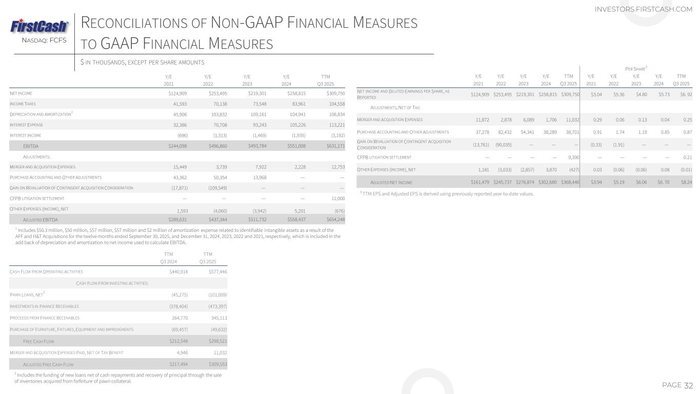 Y/E Y/E Y/E Y/E TTM 2021 2022 2023 2024 Q3 2025 NET INCOME $124,909 $253,495 $219,301 $258,815 $309,750 INCOME TAXES 41,593 70,138 73,548 83,961 104,558 DEPRECIATION AND AMORTIZATION 1 45,906 103,832 109,161 104,941 106,834 INTEREST EXPENSE 32,386 70,708 93,243 105,226 113,221 INTEREST INCOME (696) (1,313) (1,469) (1,935) (3,192) EBITDA $244,098 $496,860 $493,784 $551,008 $631,171 ADJUSTMENTS: MERGER AND ACQUISITION EXPENSES 15,449 3,739 7,922 2,228 12,753 PURCHASE ACCOUNTING AND OTHER ADJUSTMENTS 43,362 50,354 13,968 — — GAIN ON REVALUATION OF CONTINGENT ACQUISITION CONSIDERATION (17,871) (109,549) — — — CFPB LITIGATION SETTLEMENT — — — — 11,000 OTHER EXPENSES (INCOME), NET 1,593 (4,060) (3,942) 5,201 (676) ADJUSTED EBITDA $289,631 $437,344 $511,732 $558,437 $654,248 PER SHARE 3 Y/E Y/E Y/E Y/E TTM Y/E Y/E Y/E Y/E TTM 2021 2022 2023 2024 Q3 2025 2021 2022 2023 2024 Q3 2025 NET INCOME AND DILUTED EARNINGS PER SHARE, AS REPORTED $124,909 $253,495 $219,301 $258,815 $309,750 $3.04 $5.36 $4.80 $5.73 $6. 92 ADJUSTMENTS, NET OF TAX: MERGER AND ACQUISITION EXPENSES 11,872 2,878 6,089 1,706 11,032 0.29 0.06 0.13 0.04 0.25 PURCHASE ACCOUNTING AND OTHER ADJUSTMENTS 37,278 82,432 54,341 38,289 38,701 0.91 1.74 1.19 0.85 0.87 GAIN ON REVALUATION OF CONTINGENT ACQUISITION CONSIDERATION (13,761) (90,035) — — — (0.33) (1.91) — — — CFPB LITIGATION SETTLEMENT — — — — 9,390 — — — — 0.21 OTHER EXPENSES (INCOME), NET 1,181 (3,033) (2,857) 3,870 (427) 0.03 (0.06) (0.06) 0.08 (0.01) ADJUSTED NET INCOME $161,479 $245,737 $276,874 $302,680 $368,446 $3.94 $5.19 $6.06 $6. 70 $8.24 32PAGE RECONCILIATIONS OF NON-GAAP FINANCIAL MEASURES TO GAAP FINANCIAL MEASURESNASDAQ: FCFS 1 Includes $50.3 million, $50 million, $57 million, $57 million and $2 million of amortization expense related to identifiable intangible assets as a result of the AFF and H&T Acquisitions for the twelve months ended September 30, 2025, and December 31, 2024, 2023, 2022 and 2021, respectively, which is included in the add back of depreciation and amortization to net income used to calculate EBITDA. INVESTORS.FIRSTCASH.COM $ IN THOUSANDS, EXCEPT PER SHARE AMOUNTS 3 TTM EPS and Adjusted EPS is derived using previously reported year-to-date values. TTM TTM Q3 2024 Q3 2025 CASH FLOW FROM OPERATING ACTIVITIES $440,914 $577,446 CASH FLOW FROM INVESTING ACTIVITIES: PAWN LOANS, NET 2 (45,275) (101,009) INVESTMENTS IN FINANCE RECEIVABLES (378,404) (473,397) PROCEEDS FROM FINANCE RECEIVABLES 264,770 345,113 PURCHASE OF FURNITURE, FIXTURES, EQUIPMENT AND IMPROVEMENTS (69,457) (49,632) FREE CASH FLOW $212,548 $298,521 MERGER AND ACQUISITION EXPENSES PAID, NET OF TAX BENEFIT 4,946 11,032 ADJUSTED FREE CASH FLOW $217,494 $309,553 2 Includes the funding of new loans net of cash repayments and recovery of principal through the sale of inventories acquired from forfeiture of pawn collateral.