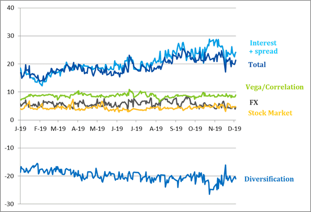 Value at Risk (VaR) is the basic variable for measuring and controlling the Group’s market risk. This risk metric estimates the maximum loss that may occur in a portfolio’s market positions for a particular time horizon and given confidence level
