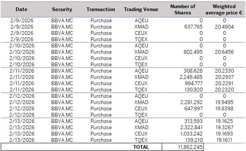 Further to the notice of inside information of 19 December 2025, with registration number 3046, relating to the execution of the first tranche of a buyback program of own shares of BBVA (the “First Tranche”), and pursuant to article 5 of Regulation (EU) no. 596/2014 of the European Parliament and of the Council of 16 April 2014 on market abuse, BBVA informs–on the basis of the information received from J.P. Morgan SE as the First Tranche manager– that it has carried out the following transactions over BBVA shares in execution of the First Tranche between 9 February and 13 February 2026 (both inclusive):