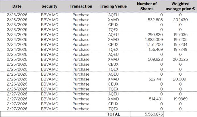 Further to the notice of inside information of 19 December 2025, with registration number 3046, relating to the execution of the first tranche of a buyback program of own shares of BBVA (the “First Tranche”), and pursuant to article 5 of Regulation (EU) no. 596/2014 of the European Parliament and of the Council of 16 April 2014 on market abuse, BBVA informs–on the basis of the information received from J.P. Morgan SE as the First Tranche manager– that it has carried out the following transactions over BBVA shares in execution of the First Tranche between 23 February and 27 February 2026 (both inclusive):