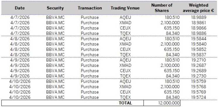 Further to the notice of inside information of 19 December 2025, with registration number in the CNMV 3046, and the notice of inside information of 20 March 2026, with registration number in the CNMV 3146 relating to the execution of the second tranche of a buyback program of own shares of BBVA (the “Second Tranche”), and pursuant to article 5 of Regulation (EU) no. 596/2014 of the European Parliament and of the Council of 16 April 2014 on market abuse, BBVA informs–on the basis of the information received from Citigroup Global Markets Europe AG as the Second Tranche manager– that it has carried out the following transactions over BBVA shares in execution of the Second Tranche between 7 April and 10 April 2026 (both inclusive):