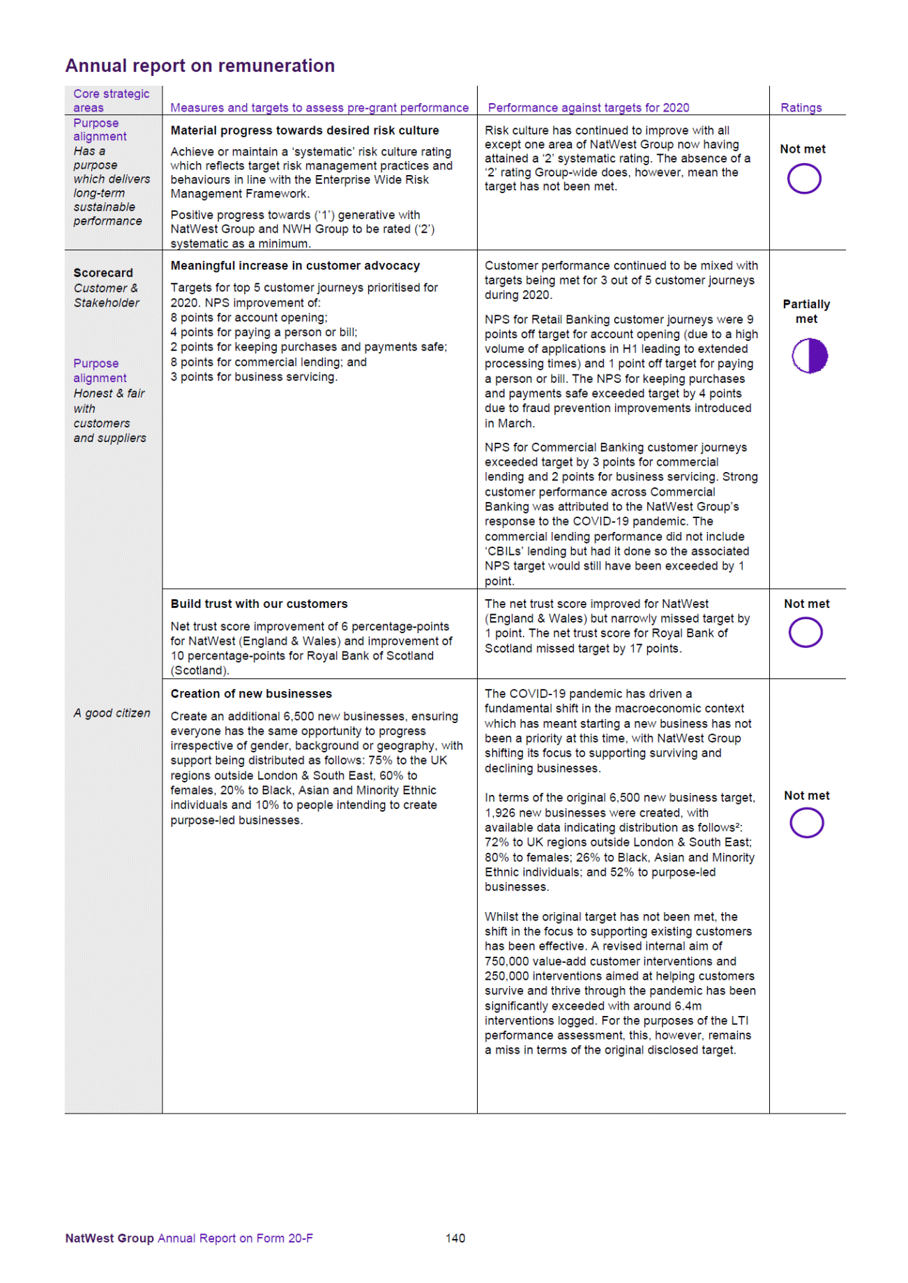 environment (in particular, as a result of the COVID-19 pandemic), and may not lead to a concurrent and proportionate reduction in required capital. .Ineffective management of such risks could have a material adverse effect on NatWest Group’s business, results of operations and outlook. The NWM Plc and NWM N.V. boards support the financial plans and budgets, but continued successful implementation of this strategy within the NWM franchise will require their continued support, as well as the support of NWM Plc and NWM N.V. management. Financial resilience risk NatWest Group may not meet targets and be in a position to continue to make discretionary capital distributions (including dividends to shareholders). As part of NatWest Group’s strategy, NatWest Group has become a UK and ROI-focused banking group and as part of its Purpose-led Strategy has set a number of financial, capital and operational targets for NatWest Group including in respect of: CET1 ratio targets, return on tangible equity (‘ROTE’), leverage ratio targets, funding plans and requirements, reductions in RWAs and the timing thereof, employee engagement, diversity and inclusion as well as environmental, social and customer satisfaction targets and discretionary capital distributions (including dividends to shareholders). See also, ‘NatWest Group is currently implementing its Purpose-led Strategy, which carries significant execution and operational risks and may not achieve its stated aims and targeted outcomes’. NatWest Group’s ability to meet its targets and to successfully meet its strategy is subject to various internal and external factors and risks. These include, but are not limited to, the impact of the COVID-19 pandemic, market, regulatory, macroeconomic and political uncertainties, operational risks and risks relating to NatWest Group’s business model and strategy (including risks associated with climate, environmental, governance and other sustainability-related issues) and litigation, governmental actions, investigations and regulatory matters. A number of factors, including the economic and other effects of the COVID-19 pandemic, may impact NatWest Group’s ability to maintain its CET1 ratio target and make discretionary capital distributions. See also, ‘NatWest Group may not meet the prudential regulatory requirements for capital and MREL, or manage its capital effectively, which could trigger the execution of certain management actions or recovery options’. NatWest Group’s ability to meet its planned reductions in its annual underlying costs may vary considerably from year to year. Furthermore, the focus on meeting cost reduction targets may result in limited investment in other areas, which could affect NatWest Group’s long-term product offering or competitive position and its ability to meet its other targets, including those related to customer satisfaction. There is a risk that NatWest Group may not meet its targets and expectations or be in a position to continue to distribute capital when regulatory distribution restrictions are eased, or that NatWest Group will be a viable, competitive or profitable banking business. Any failure of NatWest Group to meet its targets, successfully meet its strategy or make discretionary capital distributions could have a material adverse impact on NatWest Group’s business, results of operations and outlook. NatWest Group operates in markets that are highly competitive, with increasing competitive pressures and technology disruption. The markets within which NatWest Group operates are highly competitive. NatWest Group expects such competition to continue and intensify in response to the economic effects of the COVID-19 pandemic and other changes. These include evolving customer behaviour, technological changes (including digital currencies and the growth of digital banking, including from fintech entrants), competitor behaviour, new entrants to the market (including non-traditional financial services providers such as large retail or technology conglomerates, who may have competitive advantages in scale, technology and customer engagement), competitive foreign-exchange offerings, industry trends resulting in increased disaggregation or unbundling of financial services or conversely the re-intermediation of traditional banking services, and the impact of regulatory actions and other factors. In particular, developments in the financial sector resulting from new banking, lending and payment solutions offered by rapidly evolving incumbents, challengers and new entrants, notably with respect to payment services and products, and the introduction of disruptive technology may impede NatWest Group’s ability to grow or retain its share and impact its revenues and profitability, particularly in its key UK retail banking segment. Moreover, innovations such as biometrics, artificial intelligence, the cloud, blockchain, and quantum computing may rapidly facilitate industry transformation. These trends have accelerated during the COVID-19 pandemic and may be catalysed by various regulatory and competition policy interventions, including the UK initiative on Open Banking (PSD2), Open Finance and other remedies imposed by the Competition and Markets Authority (CMA) which are designed to further promote competition within retail banking, as well as the competition-enhancing measures under NatWest Group’s Alternative Remedies Package. See also, ‘The cost of implementing the Alternative Remedies Package (‘ARP’) could be more onerous than anticipated’. Increasingly many of the products and services offered by NatWest Group are, and will become, more technology intensive. For example, NatWest Group recently invested in a number of fintech ventures, including Mettle, FreeAgent, Tyl, Mentor Digital and Rapid Cash. NatWest Group’s ability to develop such digital solutions (which also need to comply with applicable and evolving regulations) has become incr