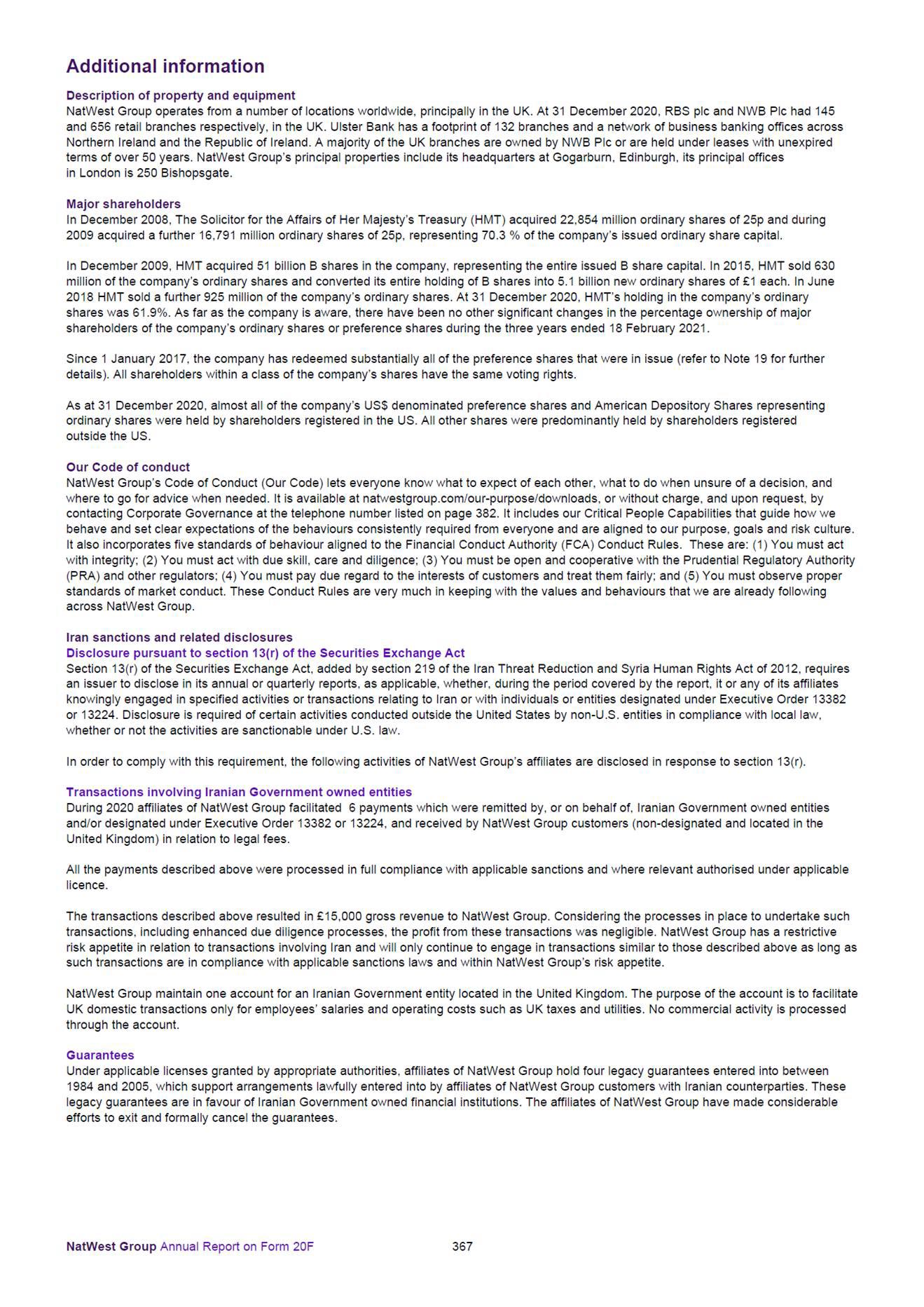 Additional information Description of property and equipment NatWest Group operates from a number of locations worldwide, principally in the UK. At 31 December 2020, RBS plc and NWB Plc had 145 and 656 retail branches respectively, in the UK. Ulster Bank has a footprint of 132 branches and a network of business banking offices across Northern Ireland and the Republic of Ireland. A majority of the UK branches are owned by NWB Plc or are held under leases with unexpired terms of over 50 years. NatWest Group’s principal properties include its headquarters at Gogarburn, Edinburgh, its principal offices in London is 250 Bishopsgate. Major shareholders In December 2008, The Solicitor for the Affairs of Her Majesty’s Treasury (HMT) acquired 22,854 million ordinary shares of 25p and during 2009 acquired a further 16,791 million ordinary shares of 25p, representing 70.3 % of the company’s issued ordinary share capital. In December 2009, HMT acquired 51 billion B shares in the company, representing the entire issued B share capital. In 2015, HMT sold 630 million of the company’s ordinary shares and converted its entire holding of B shares into 5.1 billion new ordinary shares of £1 each. In June 2018 HMT sold a further 925 million of the company’s ordinary shares. At 31 December 2020, HMT’s holding in the company’s ordinary shares was 61.9%. As far as the company is aware, there have been no other significant changes in the percentage ownership of major shareholders of the company’s ordinary shares or preference shares during the three years ended 18 February 2021. Since 1 January 2017, the company has redeemed substantially all of the preference shares that were in issue (refer to Note 19 for further details). All shareholders within a class of the company’s shares have the same voting rights. As at 31 December 2020, almost all of the company’s US$ denominated preference shares and American Depository Shares representing ordinary shares were held by shareholders registered in the US. All other shares were predominantly held by shareholders registered outside the US. Our Code of conduct NatWest Group’s Code of Conduct (Our Code) lets everyone know what to expect of each other, what to do when unsure of a decision, and where to go for advice when needed. It is available at natwestgroup.com/our-purpose/downloads, or without charge, and upon request, by contacting Corporate Governance at the telephone number listed on page 382. It includes our Critical People Capabilities that guide how we behave and set clear expectations of the behaviours consistently required from everyone and are aligned to our purpose, goals and risk culture. It also incorporates five standards of behaviour aligned to the Financial Conduct Authority (FCA) Conduct Rules. These are: (1) You must act with integrity; (2) You must act with due skill, care and diligence; (3) You must be open and cooperative with the Prudential Regulatory Authority (PRA) and other regulators; (4) You must pay due regard to the interests of customers and treat them fairly; and (5) You must observe proper standards of market conduct. These Conduct Rules are very much in keeping with the values and behaviours that we are already following across NatWest Group. Iran sanctions and related disclosures Disclosure pursuant to section 13(r) of the Securities Exchange Act Section 13(r) of the Securities Exchange Act, added by section 219 of the Iran Threat Reduction and Syria Human Rights Act of 2012, requires an issuer to disclose in its annual or quarterly reports, as applicable, whether, during the period covered by the report, it or any of its affiliates knowingly engaged in specified activities or transactions relating to Iran or with individuals or entities designated under Executive Order 13382 or 13224. Disclosure is required of certain activities conducted outside the United States by non-U.S. entities in compliance with local law, whether or not the activities are sanctionable under U.S. law. In order to comply with this requirement, the following activities of NatWest Group’s affiliates are disclosed in response to section 13(r). Transactions involving Iranian Government owned entities During 2020 affiliates of NatWest Group facilitated 6 payments which were remitted by, or on behalf of, Iranian Government owned entities and/or designated under Executive Order 13382 or 13224, and received by NatWest Group customers (non-designated and located in the United Kingdom) in relation to legal fees. All the payments described above were processed in full compliance with applicable sanctions and where relevant authorised under applicable licence. The transactions described above resulted in £15,000 gross revenue to NatWest Group. Considering the processes in place to undertake such transactions, including enhanced due diligence processes, the profit from these transactions was negligible. NatWest Group has a restrictive risk appetite in relation to transactions involving Iran and will only continue to engage in transactions similar to those described above as long as such transactions are in compliance with applicable sanctions laws and within NatWest Group’s risk appetite. NatWest Group maintain one account for an Iranian Government entity located in the United Kingdom. The purpose of the account is to facilitate UK domestic transactions only for employees’ salaries and operating costs such as UK taxes and utilities. No commercial activity is processed through the account. Guarantees Under applicable licenses granted by appropriate authorities, affiliates of NatWest Group hold four legacy guarantees entered into between 1984 and 2005, which support arrangements lawfully entered into by affiliates of NatWest Group customers with Iranian counterparties. These legacy guarantees are in favour of Iranian Government owned financial institutions. The affiliates of NatWest Group have made considerable efforts to exit and formally cancel t