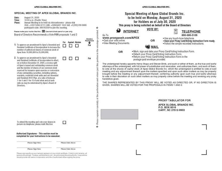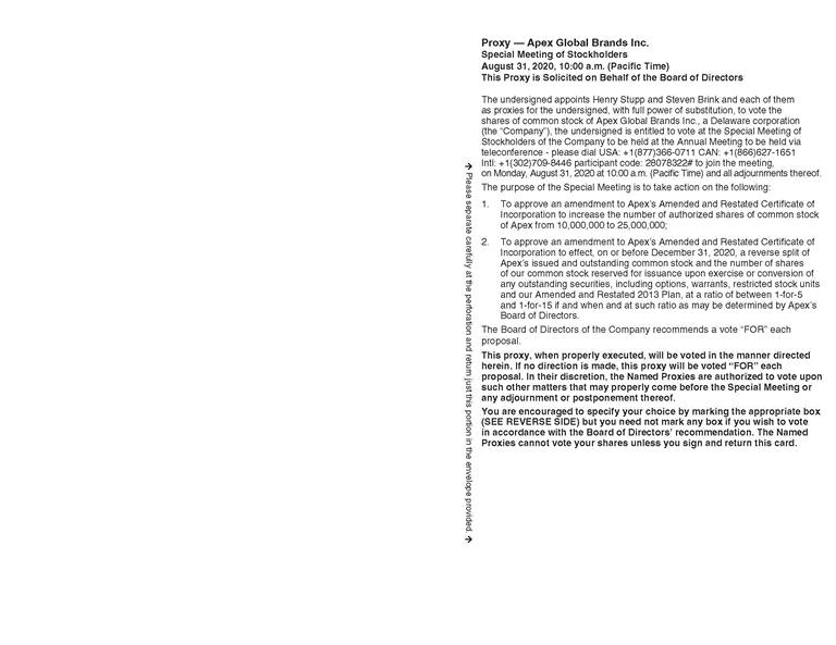 Proxy — Apex Global Brands Inc.Special Meeting of StockholdersAugust 31, 2020, 10:00 a.m. (Pacific Time)This Proxy is Solicited on Behalf of the Board of DirectorsThe undersigned appoints Henry Stupp and Steven Brink and each of them as proxies for the undersigned, with full power of substitution, to vote the shares of common stock of Apex Global Brands Inc., a Delaware corporation (the “Company”), the undersigned is entitled to vote at the Special Meeting of Stockholders of the Company to be held at the Annual Meeting to be held via teleconference - please dial USA: +1(877)366-0711 CAN: +1(866)627-1651Intl: +1(302)709-8446 participant code: 28078322# to join the meeting,on Monday, August 31, 2020 at 10:00 a.m. (Pacific Time) and all adjournments thereof.The purpose of the Special Meeting is to take action on the following:1. To approve an amendment to Apex’s Amended and Restated Certificate of Incorporation to increase the number of authorized shares of common stock of Apex from 10,000,000 to 25,000,000;2. To approve an amendment to Apex’s Amended and Restated Certificate of Incorporation to effect, on or before December 31, 2020, a reverse split of Apex’s issued and outstanding common stock and the number of shares of our common stock reserved for issuance upon exercise or conversion of any outstanding securities, including options, warrants, restricted stock units and our Amended and Restated 2013 Plan, at a ratio of between 1-for-5 and 1-for-15 if and when and at such ratio as may be determined by Apex’s Board of Directors.The Board of Directors of the Company recommends a vote “FOR” each proposal.This proxy, when properly executed, will be voted in the manner directed herein. If no direction is made, this proxy will be voted “FOR” each proposal. In their discretion, the Named Proxies are authorized to vote upon such other matters that may properly come before the Special Meeting or any adjournment or postponement thereof.You are encouraged to specify your choice by marking the appropriate box (SEE REVERSE SIDE) but you need not mark any box if you wish to vote in accordance with the Board of Directors’ recommendation. The Named Proxies cannot vote your shares unless you sign and return this card.Please separate carefully at the perforation and return just this portion in the envelope provided.