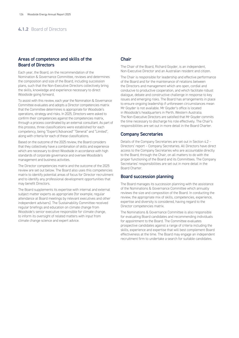Board oversight The Board oversees and considers recommendations from the Sustainability Committee on the company’s policies, performance and reporting in relation to sustainability-related matters including health and safety, process safety, the environment, climate change, human rights, Indigenous Peoples cultural heritage and engagement, security and emergency management and community relations. The Board approves relevant sustainability-related targets, monitoring performance against them, and approving recommendations from the Human Resources & Compensation Committee about the inclusion of sustainability-related metrics in executive remuneration. Board composition, skills and knowledge The Non-Executive Directors bring diverse operational and international experience, industry understanding, knowledge of financial markets and decarbonisation technologies and strategies, and insight into health, safety, environmental, community and other sustainability-related matters that are important to Woodside. The Board supplements its sustainability knowledge by seeking the input of executives, external advisers and specialists to further inform its decisions. The competencies and skills of the Directors are set out in the competencies matrix included in Section 4.1 - Corporate Governance Statement. The Director competencies matrix includes energy transition and climate-related components to reflect the importance of these issues to Woodside’s operations. The Board uses this competencies matrix to assess the skills and experience of each Director and the combined capabilities of the Board, to identify potential areas of focus for Director recruitment and to identify any professional development opportunities that may benefit Directors. Changes to the membership of Woodside’s Board of Directors are part of the continuous review of Board skills and composition. Changes are intended to enhance Woodside’s Board and Committees so that they are best placed to support Woodside’s global operations and strategic growth opportunities through the energy transition. Board committees The Board has four standing committees to assist in the discharge of its responsibilities, including on sustainability‑related matters.1 The Sustainability Committee’s responsibilities include reviewing, and making recommendations to the Board on the company’s policies, performance and reporting in relation to sustainability‑related matters. The role of the Sustainability Committee also includes: overseeing (in conjunction with the Audit and Risk Committee, as appropriate) the administration of the processes for identifying, assessing, prioritising, monitoring and managing the company’s material sustainability-related risks and opportunities; reviewing and monitoring compliance with applicable sustainability-related laws and regulations; and reviewing and recommending to the Board for approval material public sustainability-related targets and monitoring progress against those targets. The Sustainability Committee meets at least four times a year. The Audit & Risk Committee assists the Board to meet its oversight responsibilities in relation to the company’s corporate reporting, compliance with legal and regulatory requirements, accounting and sustainability standards, tax matters, internal control structure, risk management procedures, cybersecurity matters and the internal and external audit functions. Given the importance of material sustainability-related risks and opportunities to Woodside, and potential implications relating to financial reporting, the Audit & Risk Committee reviews the Company’s risk management framework, with input from management, other committees and external experts as appropriate, to ensure that it adequately deals with contemporary and emerging risks, including material sustainability-related risks (including climate-related risks and opportunities). The Audit & Risk Committee also considers the inclusion of sustainability-related risks within Woodside’s internal audit program and the appropriateness of disclosures on climate-related risk within the consolidated financial statements. More details on the management of material climate-related risks and opportunities under Woodside risk management framework, are provided in Section 3.7 – Risk Factors. The Nominations & Governance Committee assists the Board with reviewing Board composition, performance and succession planning. This includes identifying, evaluating and recommending candidates for the Board, taking into account the factors set out in the Director competencies matrix set out in Section 4.1 - Corporate Governance Statement. OVERVIEW STRATEGY AND FINANCIAL PERFORMANCE OUR BUSINESS GOVERNANCE FINANCIAL STATEMENTS ADDITIONAL INFORMATION 43 3.6.2 Governance This section of the Sustainability Report provides information about Woodside’s governance of sustainability-related risks and opportunities. This includes the Board’s oversight of them and management’s role in assessing and managing them. 1. Woodside’s Committee Charters are available on Woodside’s website at https://www.woodside.com/who-we-are/corporate-governance-and-policies