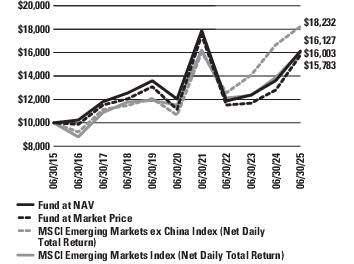 | 1 | The Custom Index reflects the returns of the MSCI Emerging Markets ex China Index (Net Daily Total Return) from February 24, 2025, the MSCI Emerging Markets Index (Net Daily Total Return) from April 30, 2018 to February 23, 2025, and the MSCI Emerging Markets Latin America Index (Net Daily Total Return) for periods prior to April 30, 2018. The indices and time periods for the Custom Index align with the strategies utilized and benchmark for the Fund during the same time periods. |
