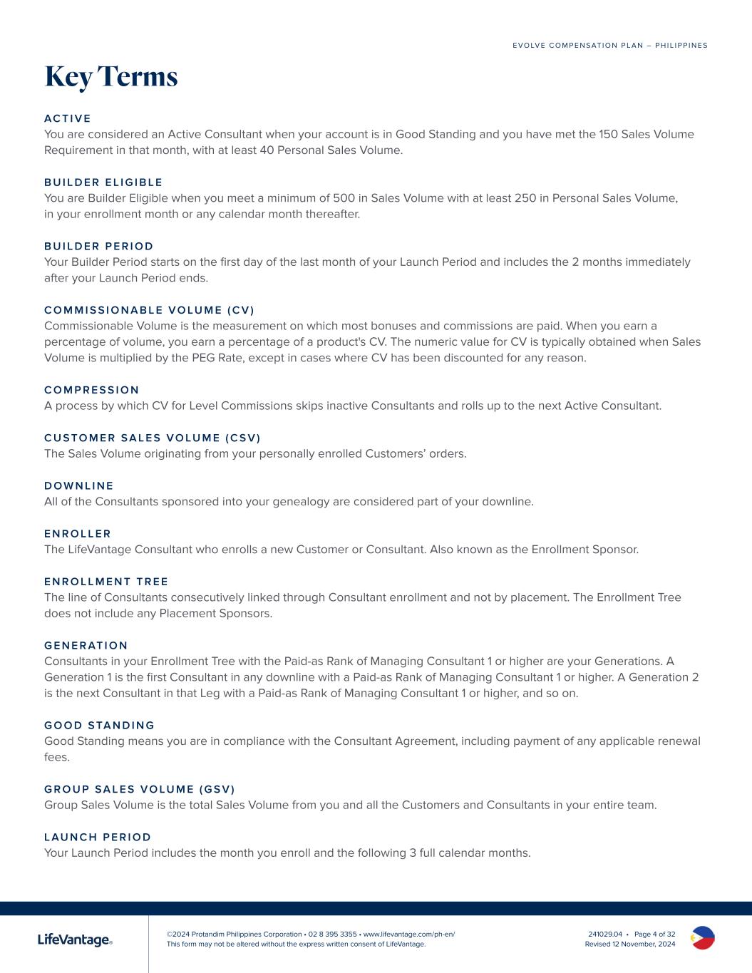 ©2024 Protandim Philippines Corporation • 02 8 395 3355 • www.lifevantage.com/ph-en/ This form may not be altered without the express written consent of LifeVantage. E V O LV E C O M P E N S AT I O N P L A N – P H I L I P P I N E S 241029.04 • Page 4 of 32 Revised 12 November, 2024 Key Terms AC T I V E You are considered an Active Consultant when your account is in Good Standing and you have met the 150 Sales Volume Requirement in that month, with at least 40 Personal Sales Volume. B U I L D E R E L I G I B L E You are Builder Eligible when you meet a minimum of 500 in Sales Volume with at least 250 in Personal Sales Volume, in your enrollment month or any calendar month thereafter. B U I L D E R P E R I O D Your Builder Period starts on the first day of the last month of your Launch Period and includes the 2 months immediately after your Launch Period ends. C O M M I S S I O N A B L E V O LU M E ( C V ) Commissionable Volume is the measurement on which most bonuses and commissions are paid. When you earn a percentage of volume, you earn a percentage of a product's CV. The numeric value for CV is typically obtained when Sales Volume is multiplied by the PEG Rate, except in cases where CV has been discounted for any reason. C O M P R E S S I O N A process by which CV for Level Commissions skips inactive Consultants and rolls up to the next Active Consultant. C U S TO M E R S A L E S V O LU M E ( C S V ) The Sales Volume originating from your personally enrolled Customers’ orders. D O W N L I N E All of the Consultants sponsored into your genealogy are considered part of your downline. E N R O L L E R The LifeVantage Consultant who enrolls a new Customer or Consultant. Also known as the Enrollment Sponsor. E N R O L L M E N T T R E E The line of Consultants consecutively linked through Consultant enrollment and not by placement. The Enrollment Tree does not include any Placement Sponsors. G E N E R AT I O N Consultants in your Enrollment Tree with the Paid-as Rank of Managing Consultant 1 or higher are your Generations. A Generation 1 is the first Consultant in any downline with a Paid-as Rank of Managing Consultant 1 or higher. A Generation 2 is the next Consultant in that Leg with a Paid-as Rank of Managing Consultant 1 or higher, and so on. G O O D S TA N D I N G Good Standing means you are in compliance with the Consultant Agreement, including payment of any applicable renewal fees. G R O U P S A L E S V O LU M E ( G S V ) Group Sales Volume is the total Sales Volume from you and all the Customers and Consultants in your entire team. L AU N C H P E R I O D Your Launch Period includes the month you enroll and the following 3 full calendar months.