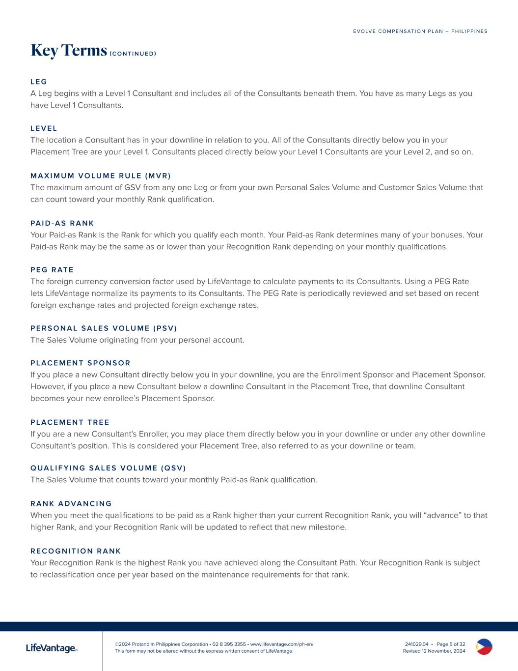 ©2024 Protandim Philippines Corporation • 02 8 395 3355 • www.lifevantage.com/ph-en/ This form may not be altered without the express written consent of LifeVantage. E V O LV E C O M P E N S AT I O N P L A N – P H I L I P P I N E S 241029.04 • Page 5 of 32 Revised 12 November, 2024 Key Terms ( C O N T I N U E D ) L E G A Leg begins with a Level 1 Consultant and includes all of the Consultants beneath them. You have as many Legs as you have Level 1 Consultants. L E V E L The location a Consultant has in your downline in relation to you. All of the Consultants directly below you in your Placement Tree are your Level 1. Consultants placed directly below your Level 1 Consultants are your Level 2, and so on. M A X I M U M V O LU M E R U L E ( M V R ) The maximum amount of GSV from any one Leg or from your own Personal Sales Volume and Customer Sales Volume that can count toward your monthly Rank qualification. PA I D - A S R A N K Your Paid-as Rank is the Rank for which you qualify each month. Your Paid-as Rank determines many of your bonuses. Your Paid-as Rank may be the same as or lower than your Recognition Rank depending on your monthly qualifications. P E G R AT E The foreign currency conversion factor used by LifeVantage to calculate payments to its Consultants. Using a PEG Rate lets LifeVantage normalize its payments to its Consultants. The PEG Rate is periodically reviewed and set based on recent foreign exchange rates and projected foreign exchange rates. P E R S O N A L S A L E S V O LU M E ( P S V ) The Sales Volume originating from your personal account. P L AC E M E N T S P O N S O R If you place a new Consultant directly below you in your downline, you are the Enrollment Sponsor and Placement Sponsor. However, if you place a new Consultant below a downline Consultant in the Placement Tree, that downline Consultant becomes your new enrollee’s Placement Sponsor. P L AC E M E N T T R E E If you are a new Consultant's Enroller, you may place them directly below you in your downline or under any other downline Consultant’s position. This is considered your Placement Tree, also referred to as your downline or team. Q UA L I F Y I N G S A L E S V O LU M E ( Q S V ) The Sales Volume that counts toward your monthly Paid-as Rank qualification. R A N K A D VA N C I N G When you meet the qualifications to be paid as a Rank higher than your current Recognition Rank, you will “advance” to that higher Rank, and your Recognition Rank will be updated to reflect that new milestone. R E C O G N I T I O N R A N K Your Recognition Rank is the highest Rank you have achieved along the Consultant Path. Your Recognition Rank is subject to reclassification once per year based on the maintenance requirements for that rank.