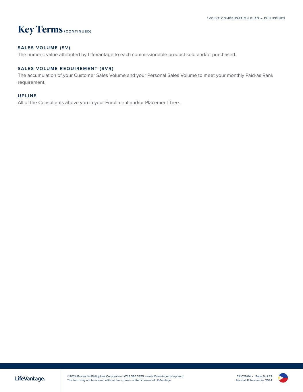 ©2024 Protandim Philippines Corporation • 02 8 395 3355 • www.lifevantage.com/ph-en/ This form may not be altered without the express written consent of LifeVantage. E V O LV E C O M P E N S AT I O N P L A N – P H I L I P P I N E S 241029.04 • Page 6 of 32 Revised 12 November, 2024 Key Terms ( C O N T I N U E D ) S A L E S V O LU M E ( S V ) The numeric value attributed by LifeVantage to each commissionable product sold and/or purchased. S A L E S V O LU M E R E Q U I R E M E N T ( S V R ) The accumulation of your Customer Sales Volume and your Personal Sales Volume to meet your monthly Paid-as Rank requirement. U P L I N E All of the Consultants above you in your Enrollment and/or Placement Tree.